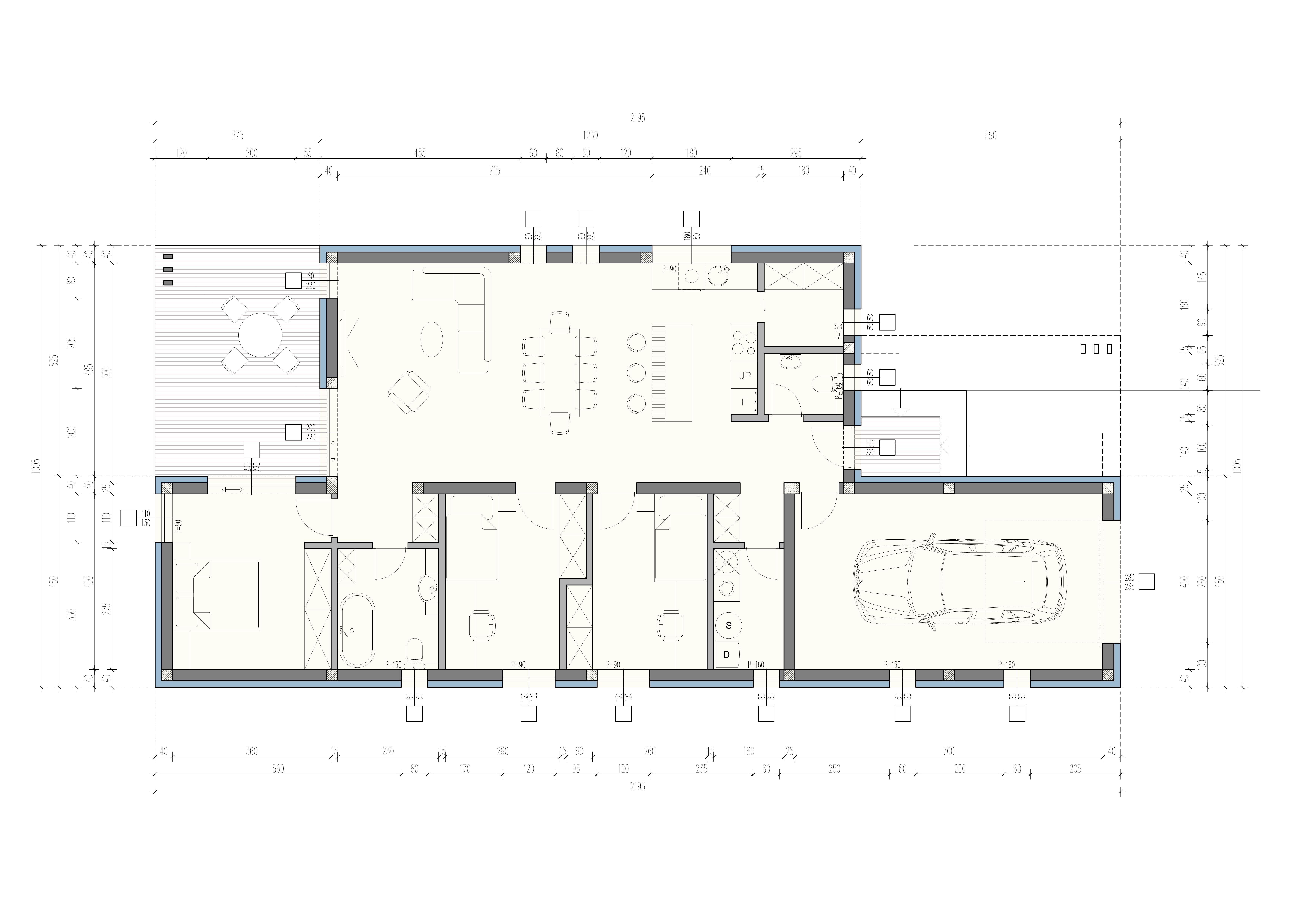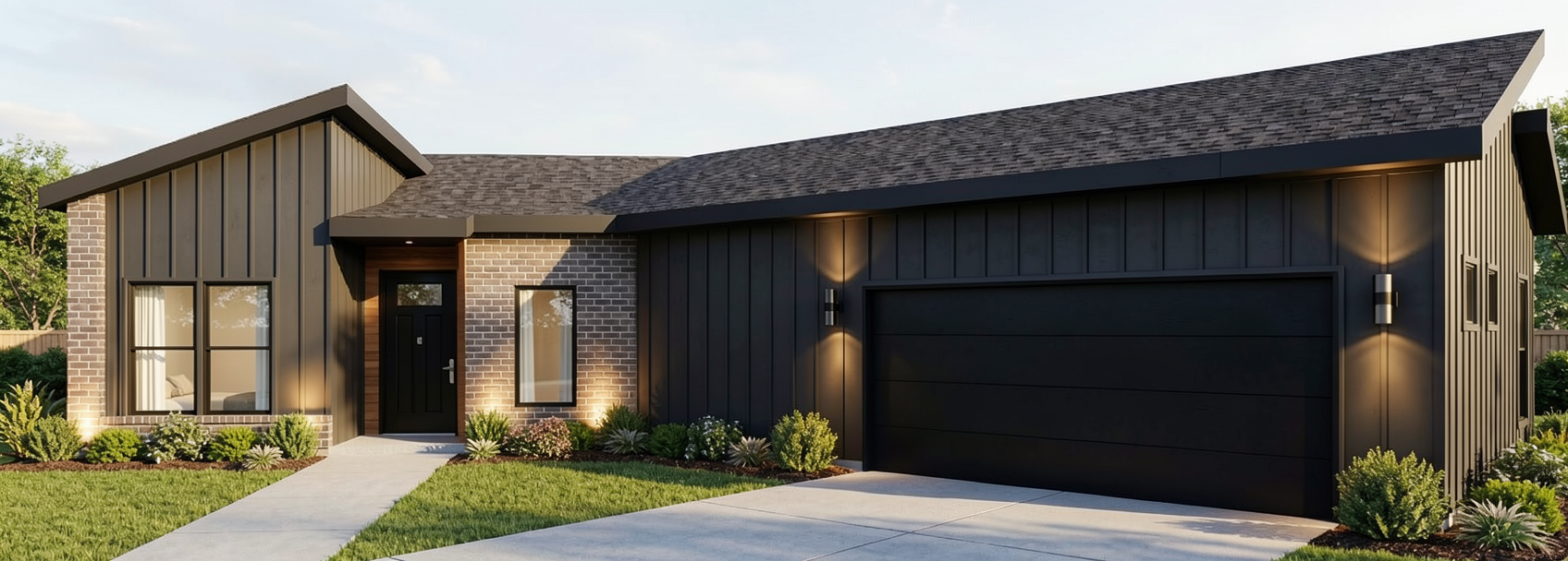 aerial view of an architectural site plan with a modern house floor plan in the center surround the area with lush greenery such as vibrant green trees and bushes creating a serene environment use soft blue hues for the layout lines and pathways adding a calming effect the boundary line is a bold purple with gentle shadows to provide depth set the atmosphere as tranquil and inviting with natural sunlight gently illuminating the scene and subtle gradients in the sky to evoke a peaceful morning
