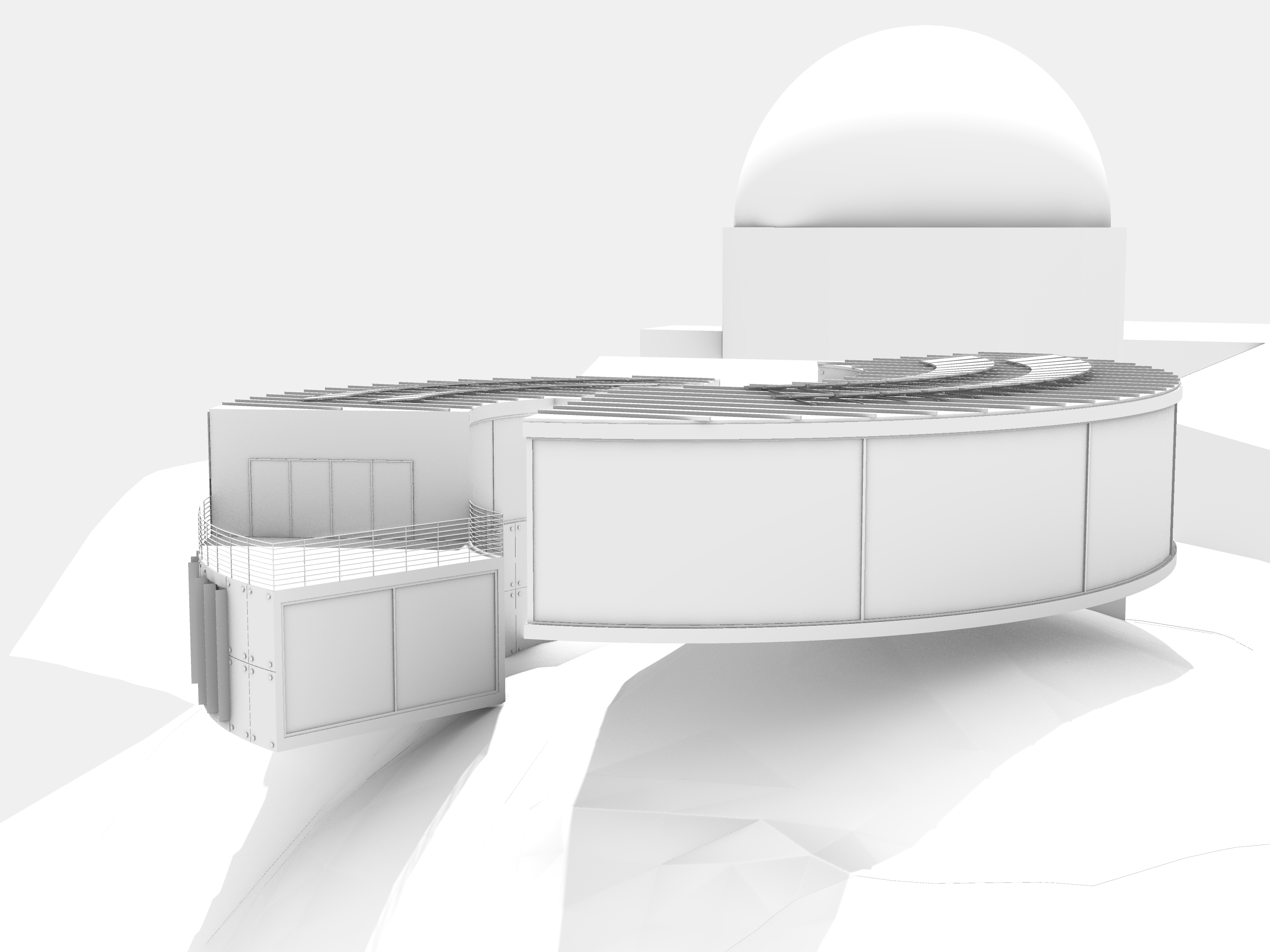 architectural realistic grayscale rendering of a small research station perched on a rocky terrain structure made of metal panels and mirrored reflective glass precise and realistic architectural detailing cantilevered over stone terrain supported by steel beams surrounded by mountain pines and mist below rendered with crisp building geometry and realistic materials background and edges dissolve into the mist edges not full bleed with soft unfinished fade around the image soft ambient lighting overcast sky moody grayscale rendering high detail model aesthetic conceptual design architecture studio presentation style