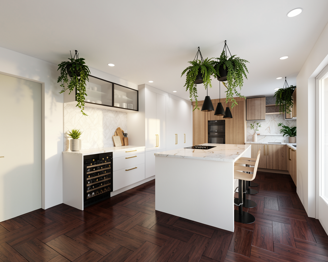 i want a creamy grey kitchen cabinets with a light brown mortex cementlook countertop and luxurious lighting the opening in the wall leads to a living room