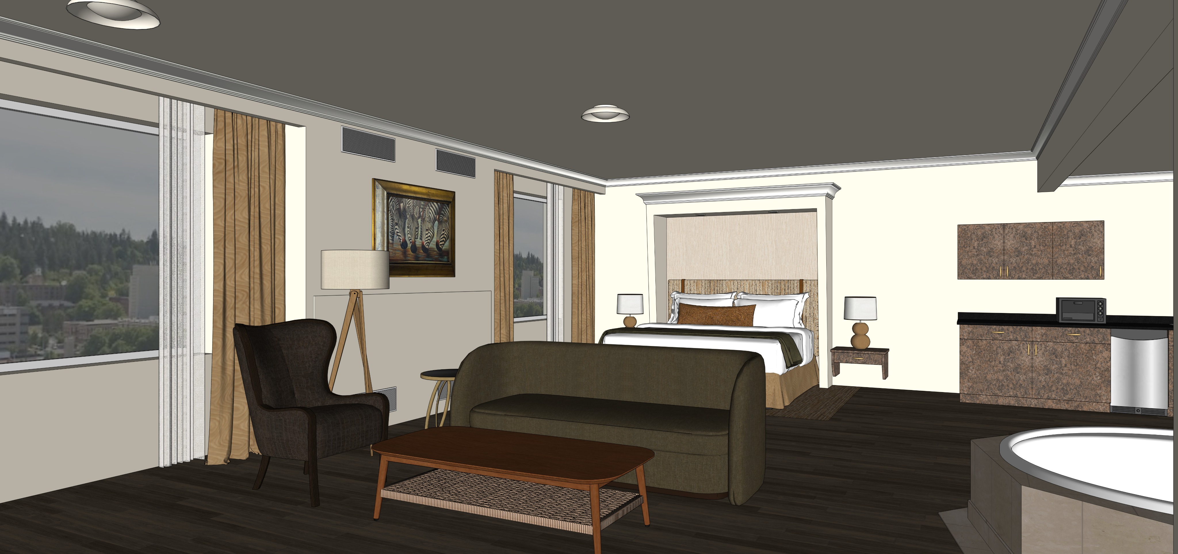 render this hotel room image using natural daylight through the windows and low ambient lighting in the rooms