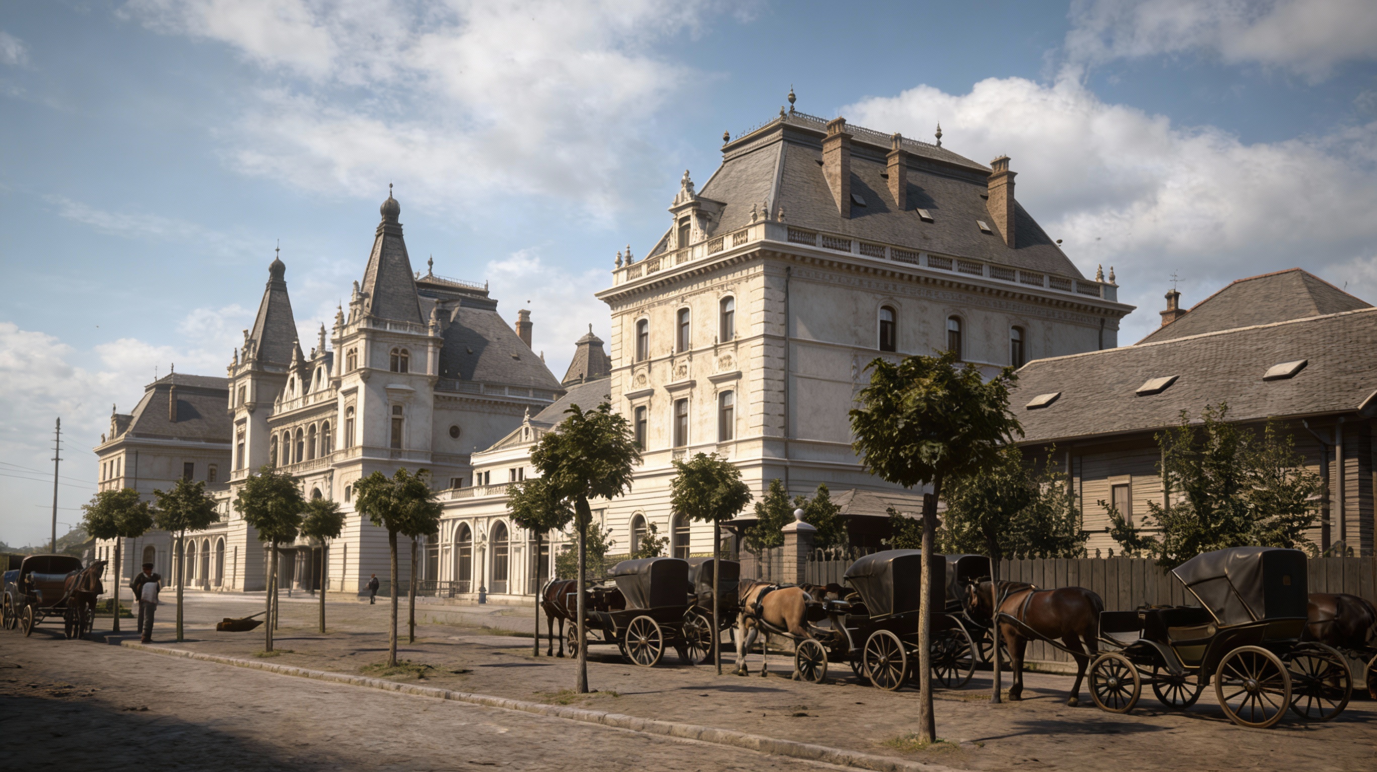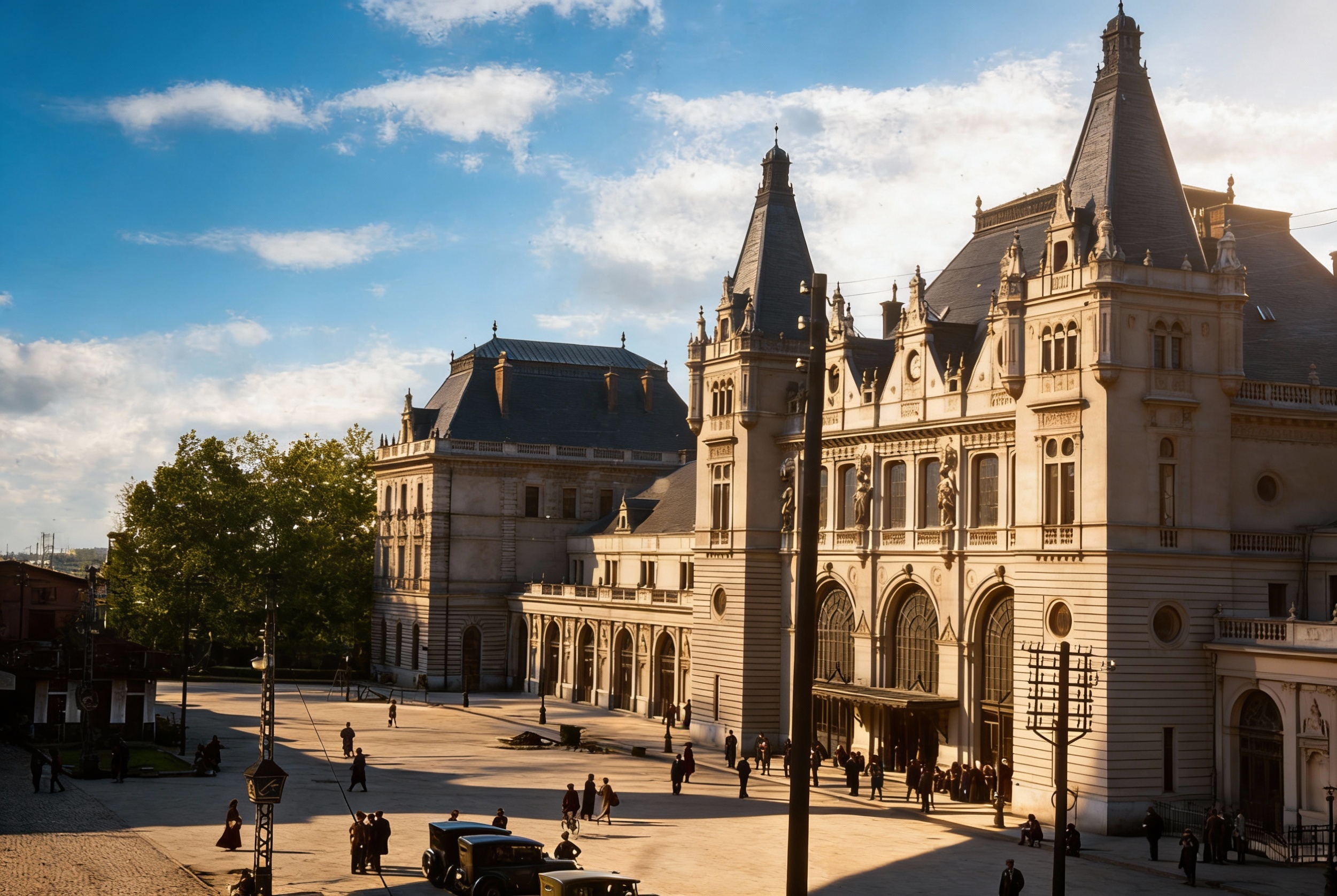 sunny day 1900 s style atmosphere beautyful clouds emove text from top of the picture shiny tramtrack color cinematic hyperrealistic view