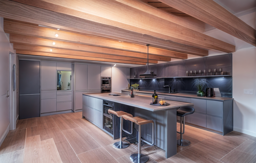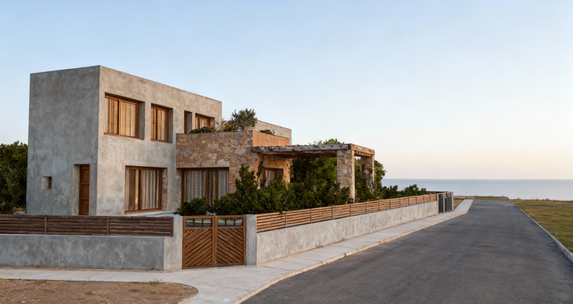 render with slightly rough cement concrete grey on the grey part and traditional greek stone xerolithia light beige colour on the brown part and the pergola rough wood