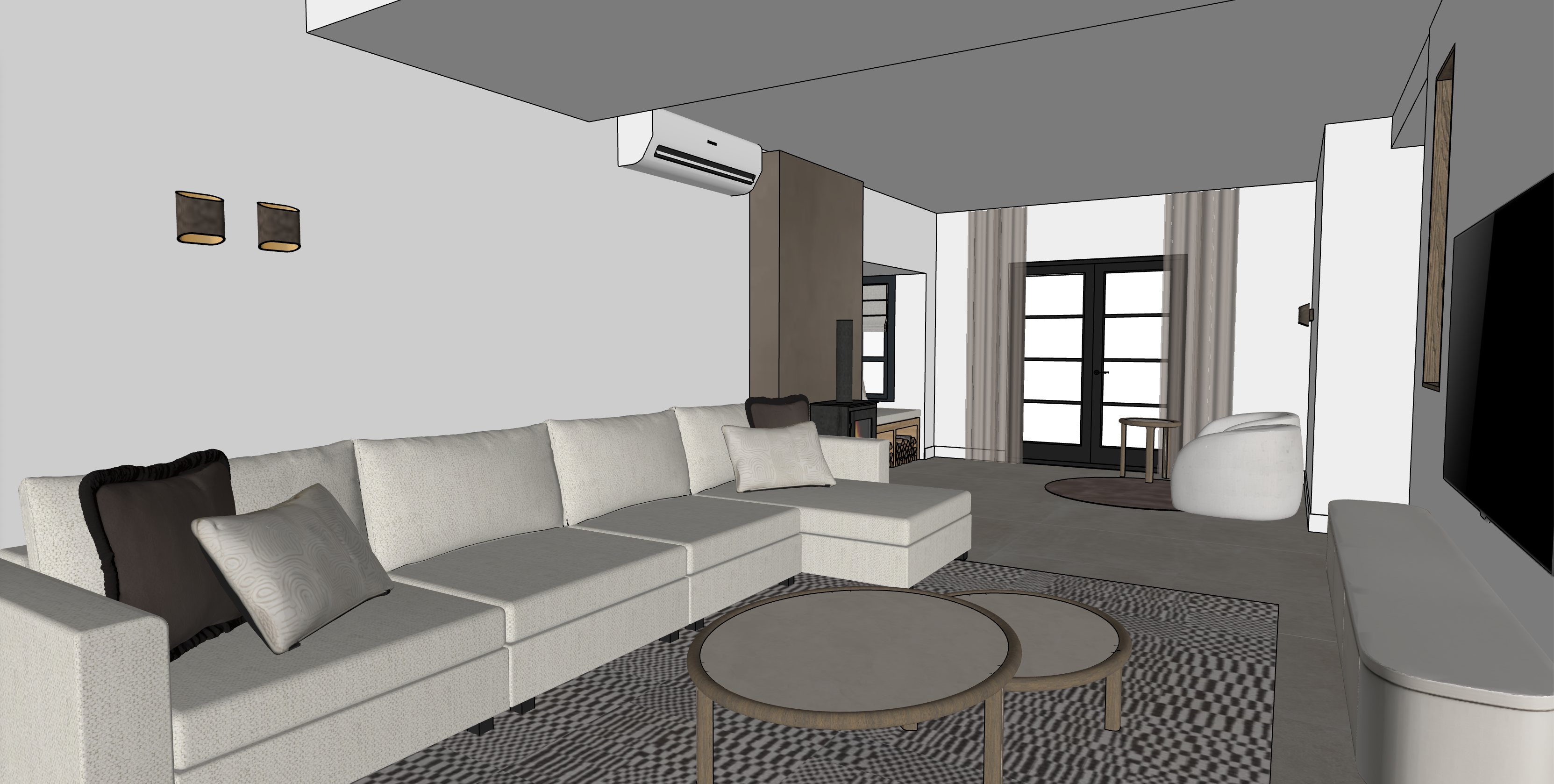 coffeetable walnut beige stucco tv cabinet beige plastic carpet berber wall behind fireplace is metallic stucco in grey brown