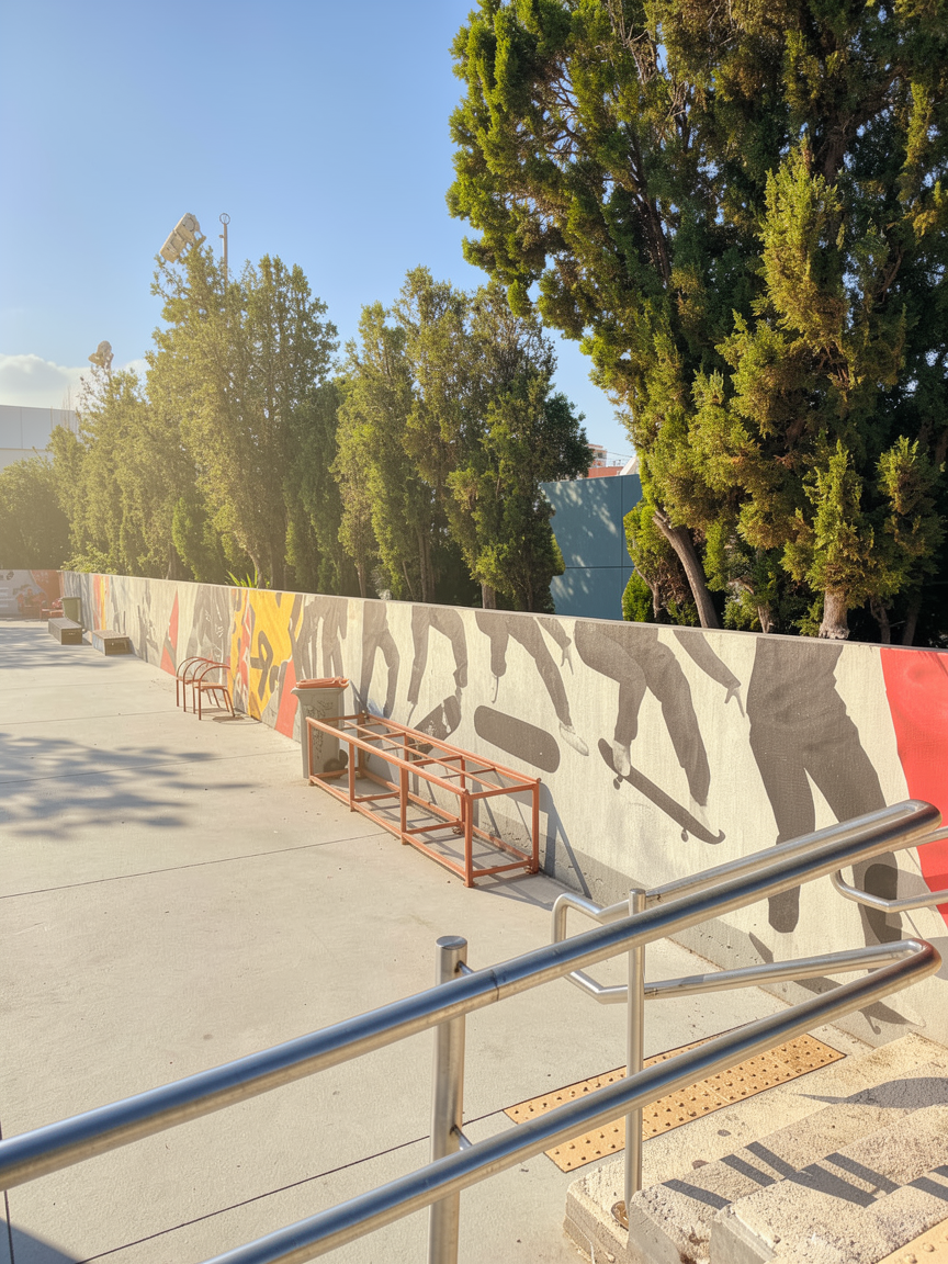 make more realistic add trees in background make public space in front of main building seating for a cafe cafe interior is only within the left three column bays while the right column bay is a recessed exterior entrance to the main building cafe and entrance must be at grade no steps up cafe patio should extend out to sidewalk but not spill onto it cafe should be minimalist like the blue bottle cafe in kyoto with wood paneling maintain proportions of street sidewalk etc this is set on a side street in toronto and should have local vegetation address is 120 westmoreland avenue please use neighbouring houses refer to reference image below for material palette https i pinimg com 1200x 2d 01 99 2d019950bd49ff3c2033d2db31656de8 jpg