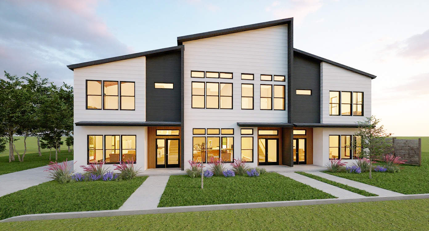 make the grass more realistic sunlight is softly lighting the house there is a road and neighborhood on the left side of the house there are trees and a house on the far right side of the image