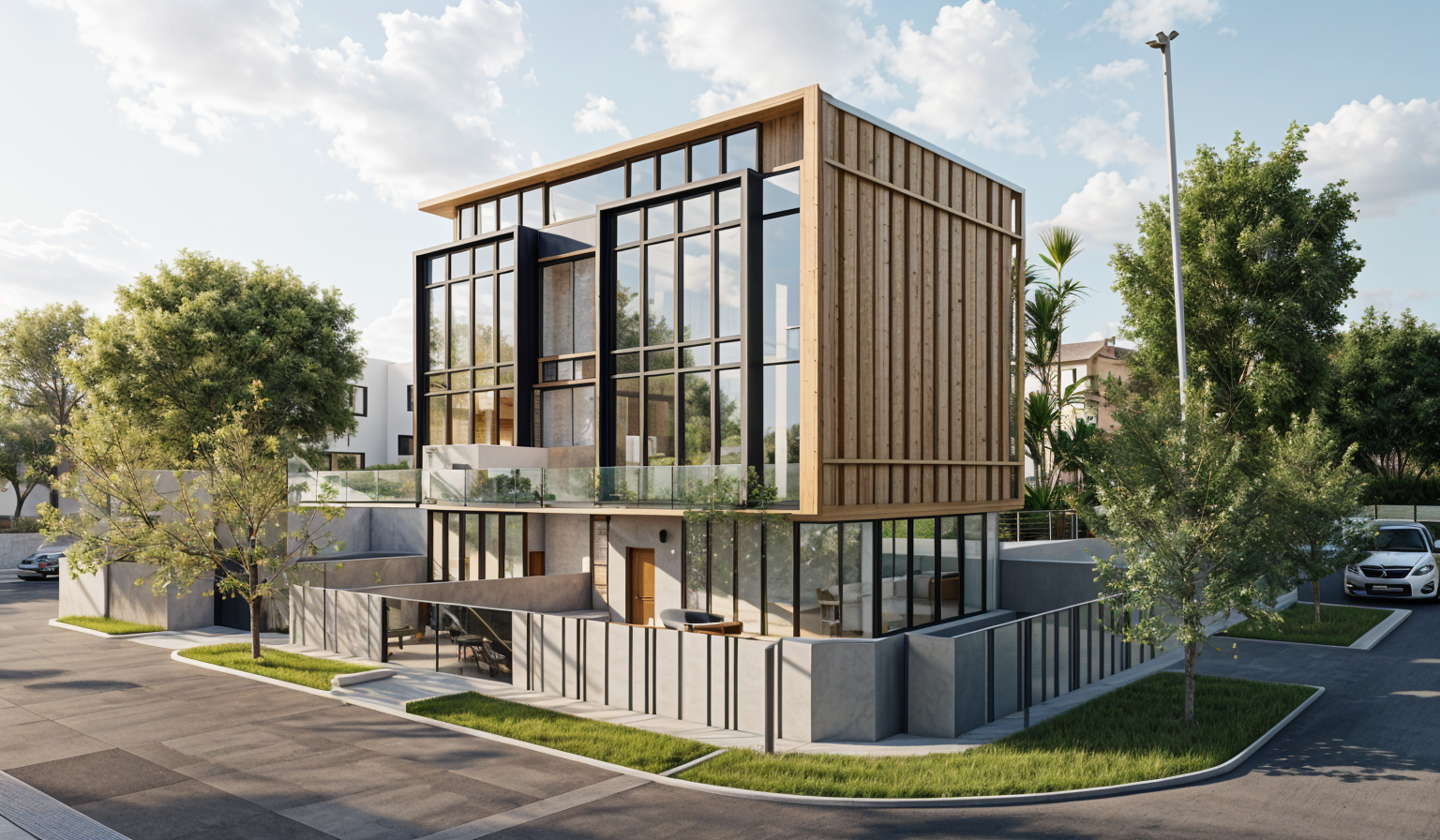 carlo scarpa exterior shot maintain the exact shape of the room and the angle of view create a photorealistic visualization of a women s hair salon combined with a wellness space in a modern exotic style the design should be modern clean and elegant with a strong focus on natural materials space requirements reception desk within the salon area spiral staircase in the right corner leading to the upper floor buddha artwork on the walls as subtle decorative elements natural clay plaster walls with soft texture large white flower shaped chandelier on the ceiling as a dominant design feature the space combines hair salon and wellness area style and materials modern exotic style natural materials wood rattan stone linen light natural colors beige sand white soft natural tones live plants and exotic greenery calm luxurious relaxing atmosphere minimalist elegant airy space rendering requirements photorealistic soft natural lighting high quality materials realistic textures wide angle interior view architecture
