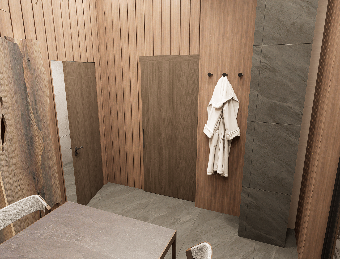 a hyper realistic visualization created from a sketch don t change the arrangement of furniture windows or other objects and don t add anything textures are modern and minimalist don t change the placement of textures on surfaces make them realistic soft natural light from the windows realistic shadows ultra realistic architectural photography a cozy atmosphere hd resolution