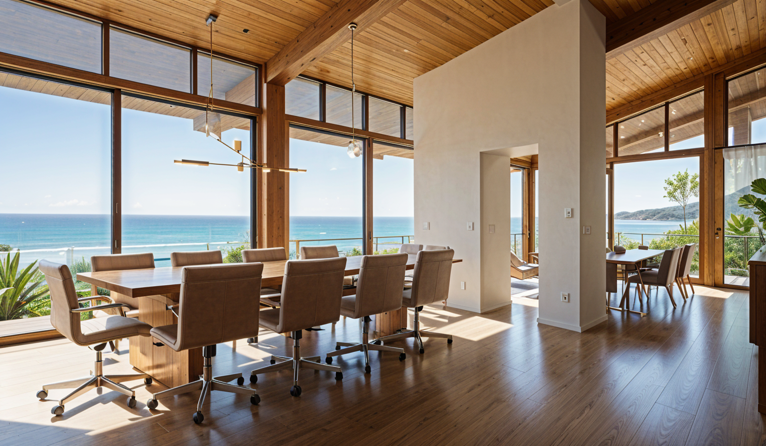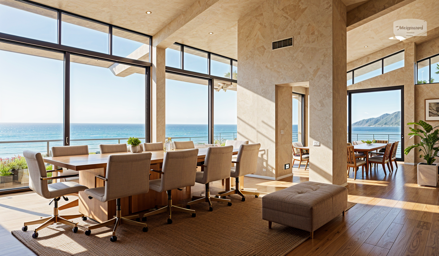 render this space the material of the stairs is ivory french versalle pattern same as the floor the walls are smoth white and the window frame is also white and the glass looks at a forest add rails on the stairs and add wall art in the black panels that is traditional and goes with the space the art should not excied the size in the picture