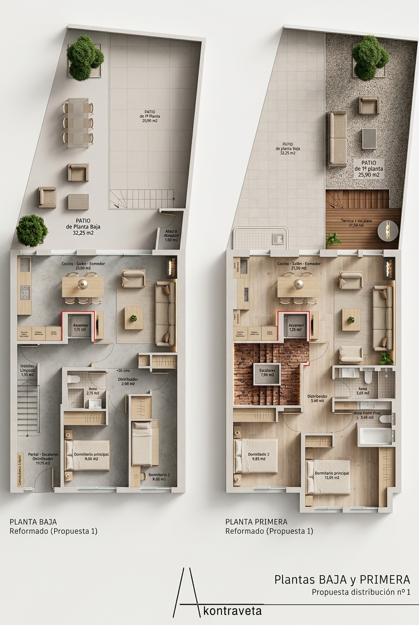 suelo madera en las dos plantas el patio con cesped las escaleras en cemento el resto mantener igual
