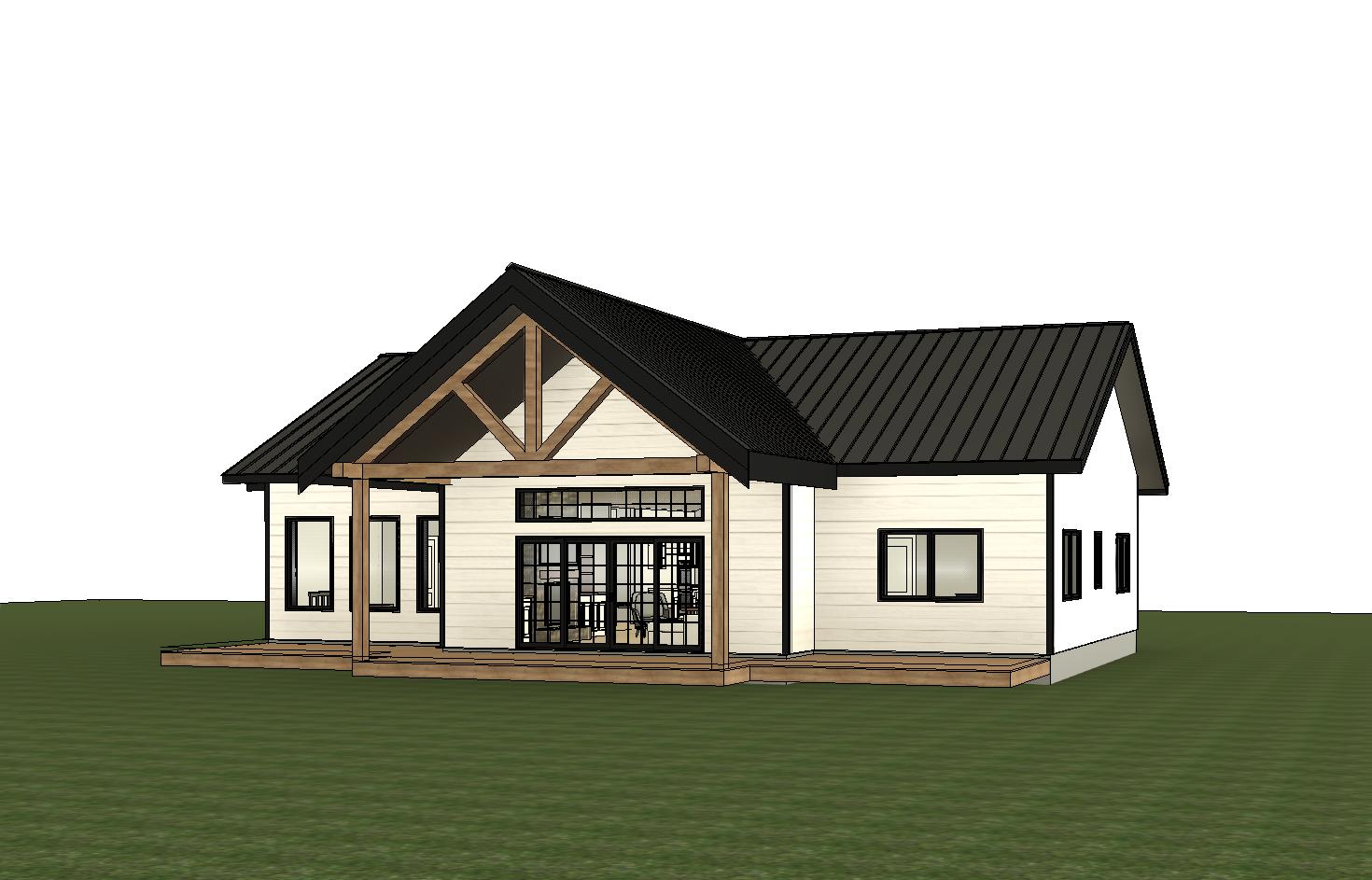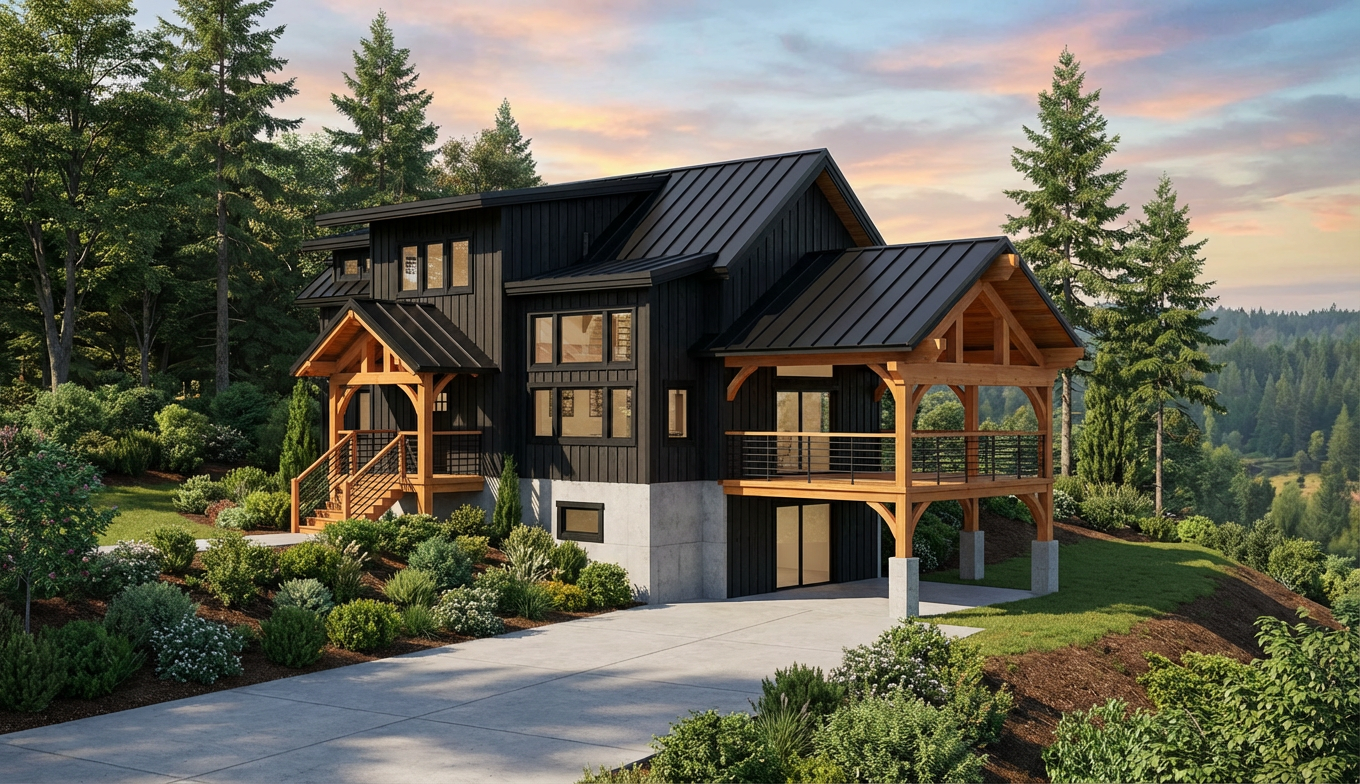 a country style rancher home with a combination of white horizontal lap siding and white board batten black fascia soffit black corner trim bronze tinted windows black standing seam metal roofing exposed natural timber posts and beams enhance materials and colors keep exact window structure arrangement deck columns beams rooflines and proportions exactly as shown in the reference image soft interior lighting inside the home creates warmth add some common landscaping features around the home such as flowers rocks bushes walkways surround the property with a lush dense forest of tall mixed evergreens and hardwoods place the sun behind the trees so warm golden sunlight beams through the branches casting soft rays and subtle dappled highlights across the patio siding and grass create ultra realistic lighting crisp shadows detailed textures in the wood and glass reflections and a vibrant clear sky with light atmospheric depth render in hyper realistic architectural visualization quality 8k resolution