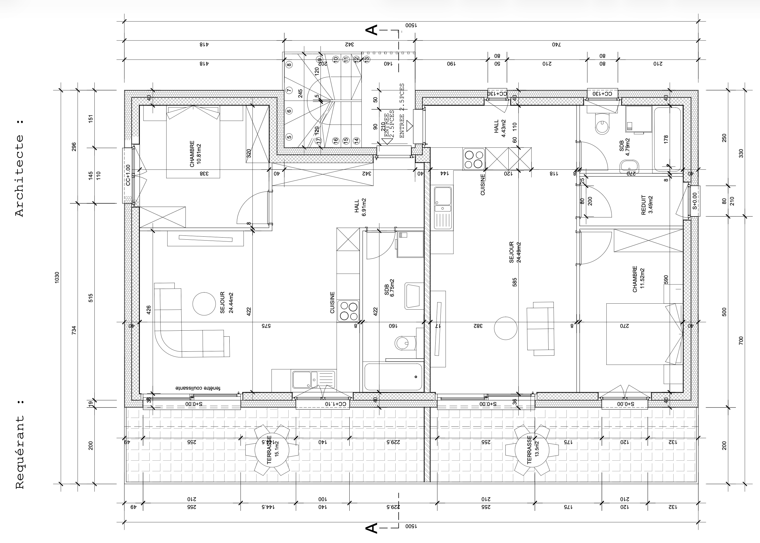 convert this floor plan into a realistic isometric 3d view of a full house show the space from an elevated angle with furniture walls and details visible the layout must remain fully consistent ground floor of the building attached featuring a private outdoor space for the residence with well kept grass elegant landscaping and trees use the same furniture as shows on the plan do not change the orientation of the floorplan