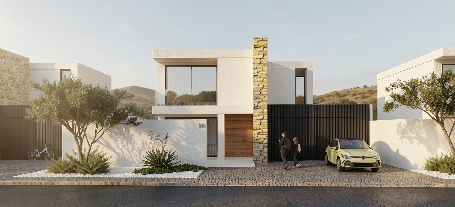 image type photorealistic architectural image indistinguishable from real photography scene camera frontal street level shot of a modern mediterranean house camera at eye level 1 60 m 35mm lens no distortion everything sharp and in focus photographic intent critical the image must read as a professional architectural photograph not a render strong perception of volume and depth materials must react to light with clear contrast between illuminated and shadowed planes visible micro contrast and surface response no flat lighting no uniform shading light primary driver mediterranean sun from the left hard directional sunlight clear separation between light and shadow contact shadows where elements meet ground walls vegetation subtle bounce light in shadow areas to avoid flat darkness introduce specular response small highlights on stone edges soft reflections on glass and car slight sheen on pavement light must define geometry not just illuminate material behavior no cgi all materials must show physical response to light stucco slight tonal variation micro shadowing stone depth crevices catching shadow wood grain visible absorbs light unevenly pavement slight irregularity not uniform car controlled reflections not flat color no plastic surfaces no uniform shaders vegetation depth mass vegetation must behave as solid volume not texture dense canopy with internal shadows leaves catching light unevenly clear separation between foreground and background layers no blur no cut out effect background force quality background must be reconstructed if necessary hills with real topography not smooth shapes visible vegetation texture and variation atmospheric depth but still sharp no blur no flat gradients no low detail background image structure strong foreground midground background separation readable depth clear edges defined by light not outlines color natural mediterranean palette warm light neutral shadows no grey wash no desaturation loss style high end editorial architecture photography magazine quality clean sharp material driven real world photographic realism quality ultra realistic high micro detail sharp image across all planes no noise no blur restrictions do not produce flat lighting do not blur background or reflections do not use uniform textures do not simplify geometry or terrain avoid any cgi appearance