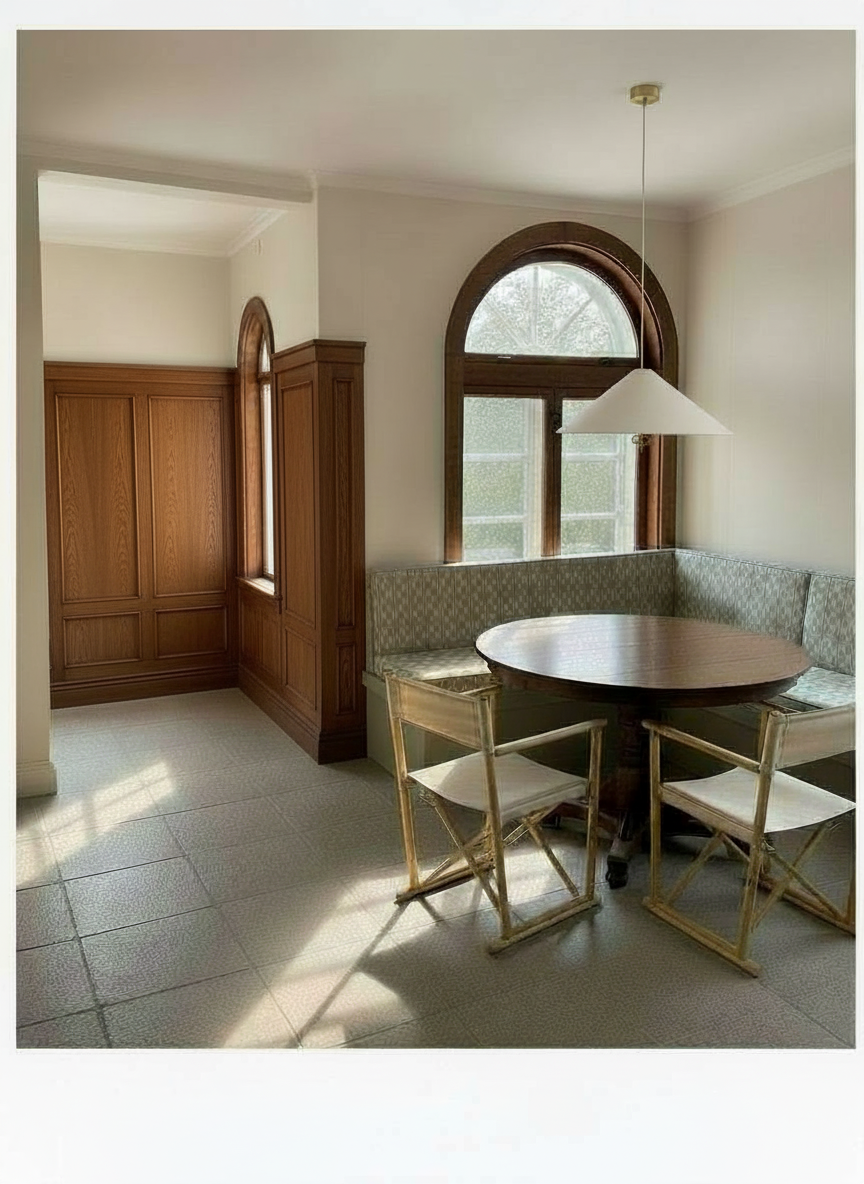 exterior shot use the same color and texture seen in the reference image and use on the small arched window in the render