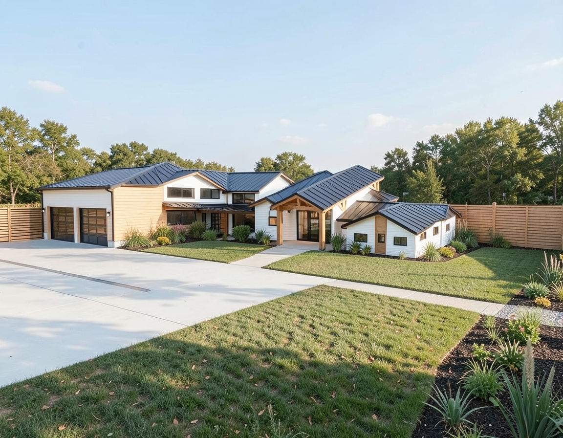 12 black standing seam roof white board and batten siding natural wood post and beams flat grassy landscape planting at perimeter all posts to be natural wood to match modern horizontal wood fence fix roof
