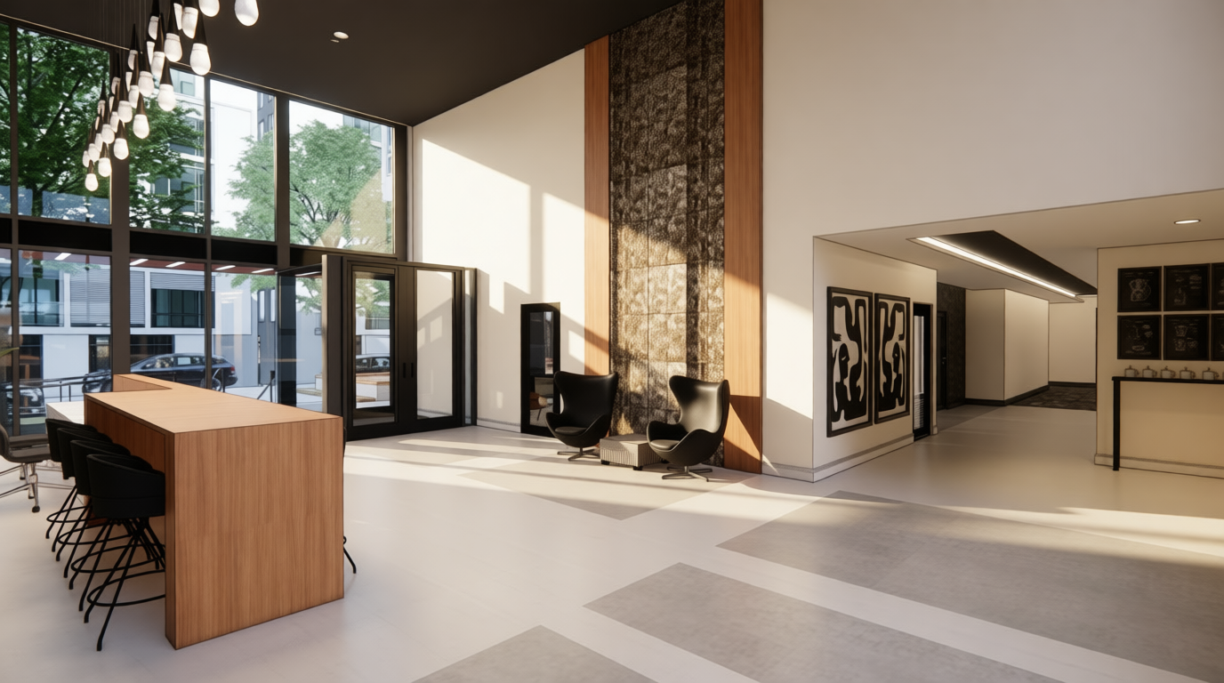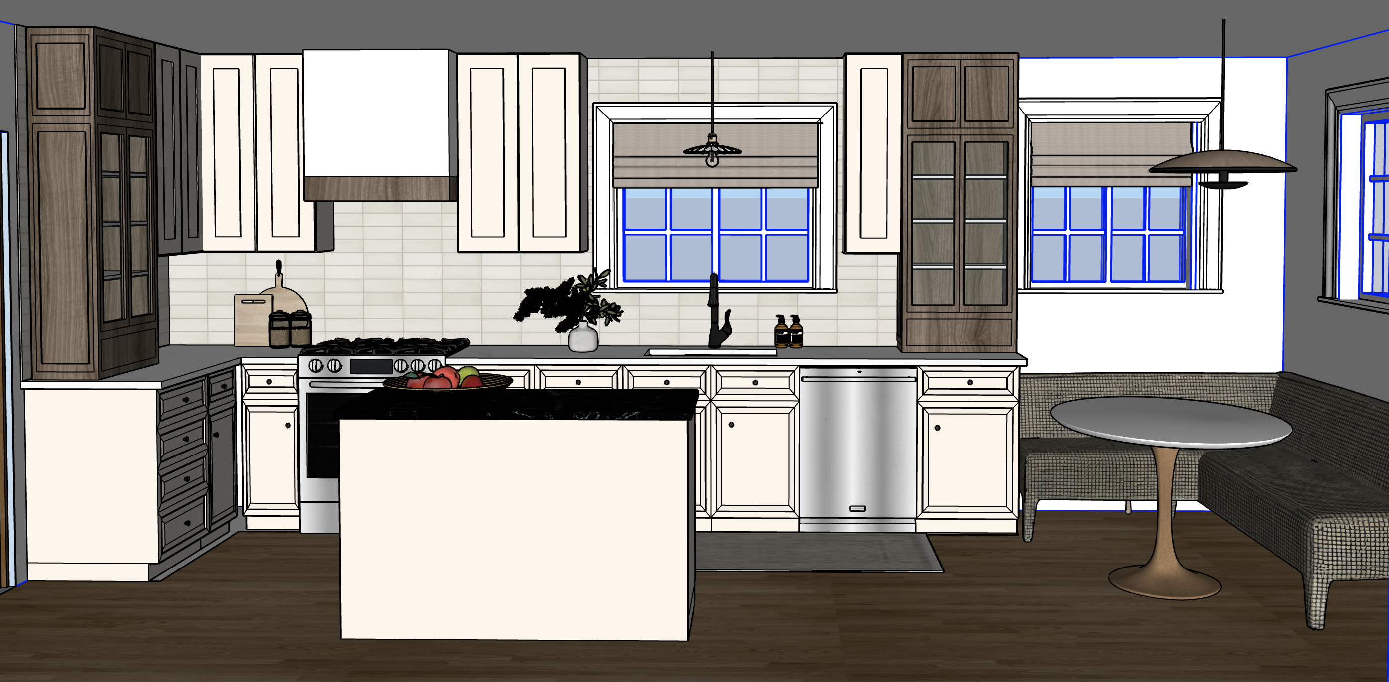 make the counters against the wall a white quartz with subtle grey veining and keep the island stone black as is lighten the walnut tone on the two tall wood cabinets and make the light more natural sunlight