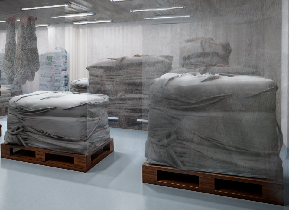 a large interior of a refrigerator camera there is a pallet base with a bundle of fruit sacks wrapped in transparent plastic shrink wrap