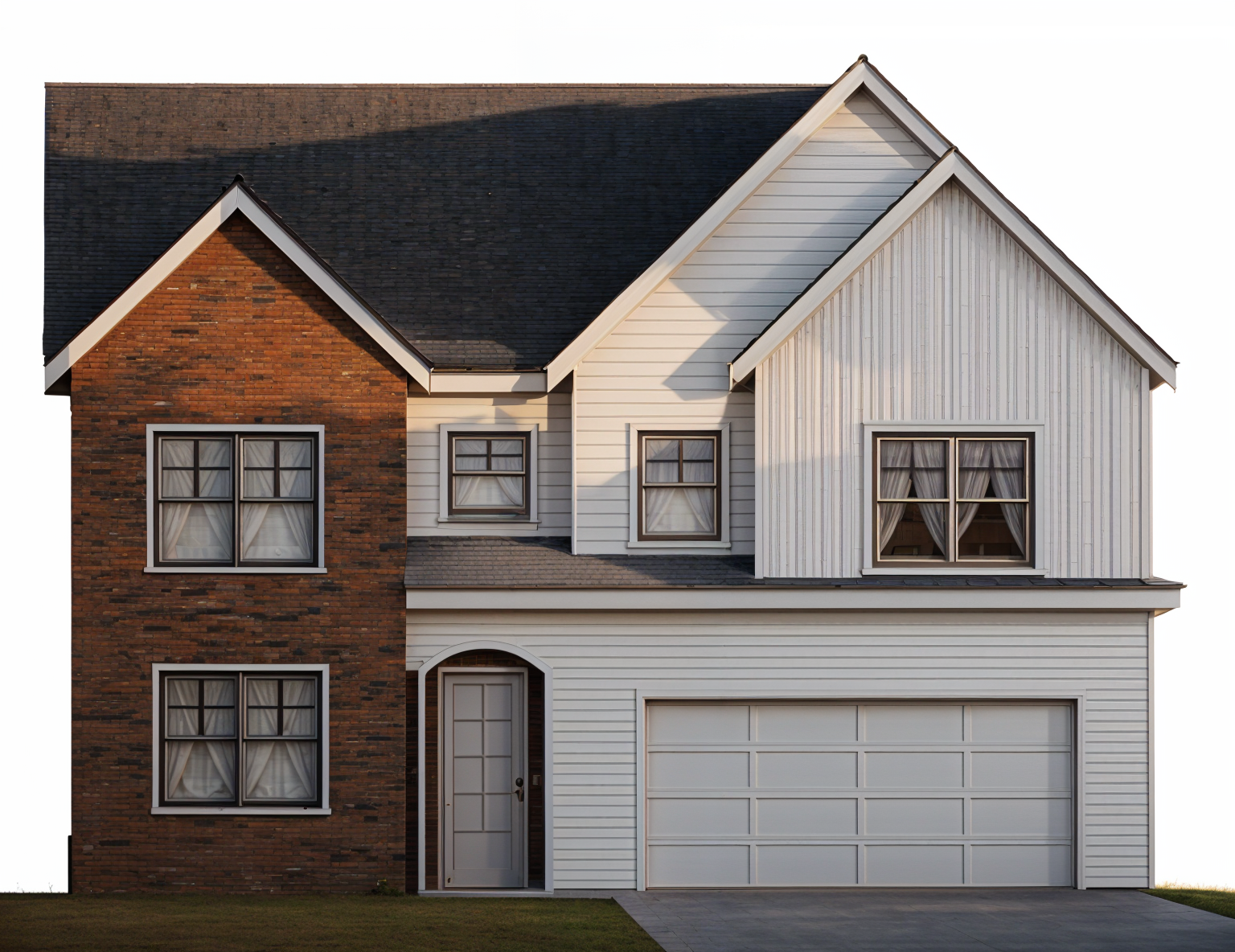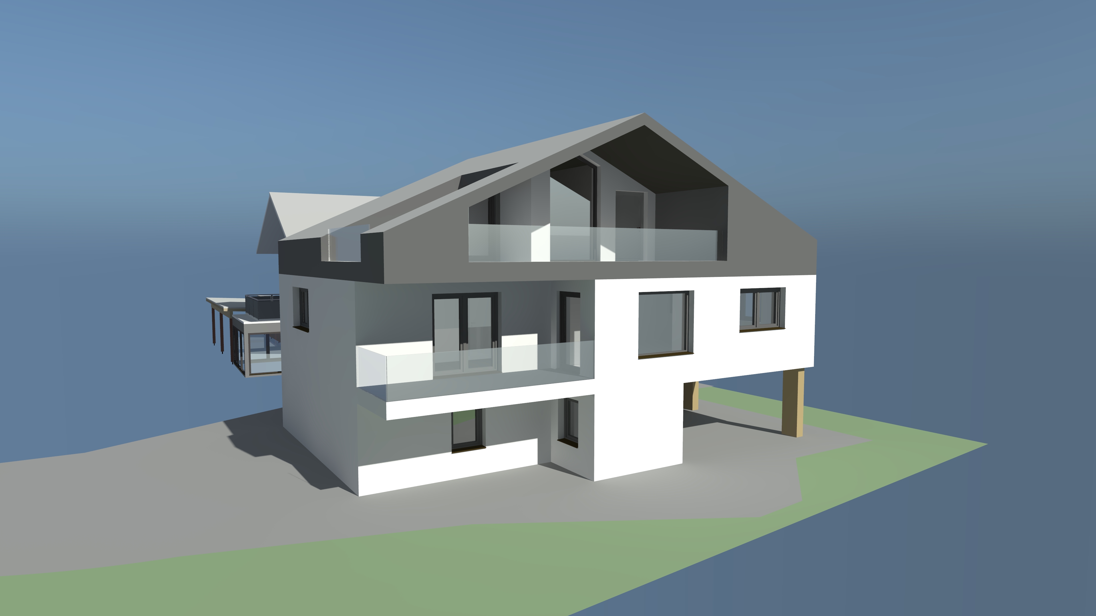the attic grey should be clad with a vertical metal fa ade using standing seam panels the rest very modern with plants in the foreground in the background there should be a few trees the scene should be brought to life with garden furniture and people