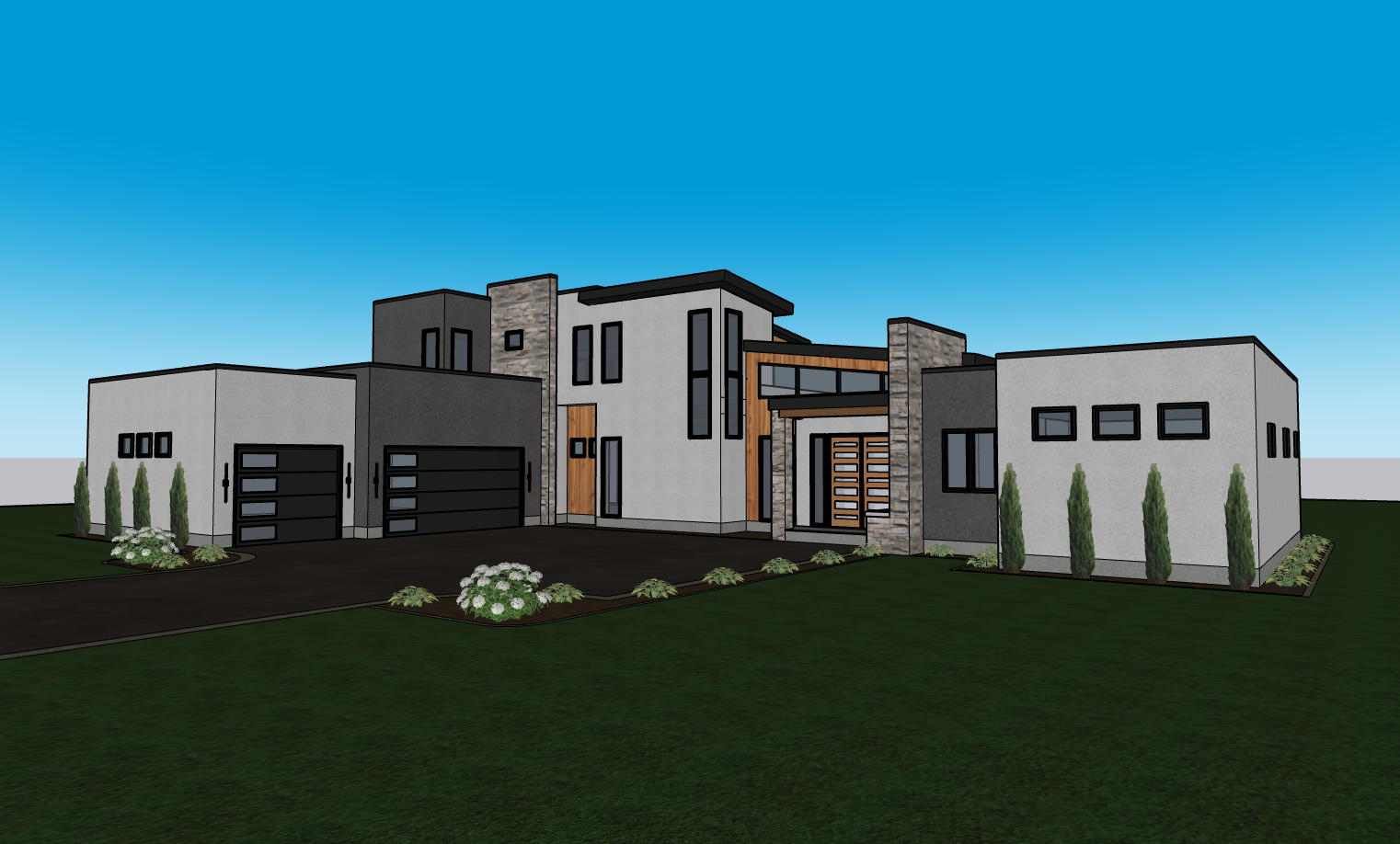 modern luxury house sleek and elegant design use a light gray stucco exterior with some portions a darker gray stucco with soft gray stone accents incorporate black window frames and a black metal roof and soffits add warm wooden elements with a natural cedar finish for the doors and decorative panels the driveway should have a smooth black asphalt texture surround the house with vibrant green grass well manicured and lush add small bushes with white flowers and tall slender dark green juniper skyrocket trees for landscaping set the scene under a blue sky around noon evoking a luxurious and inviting atmosphere keep ambient lighting high