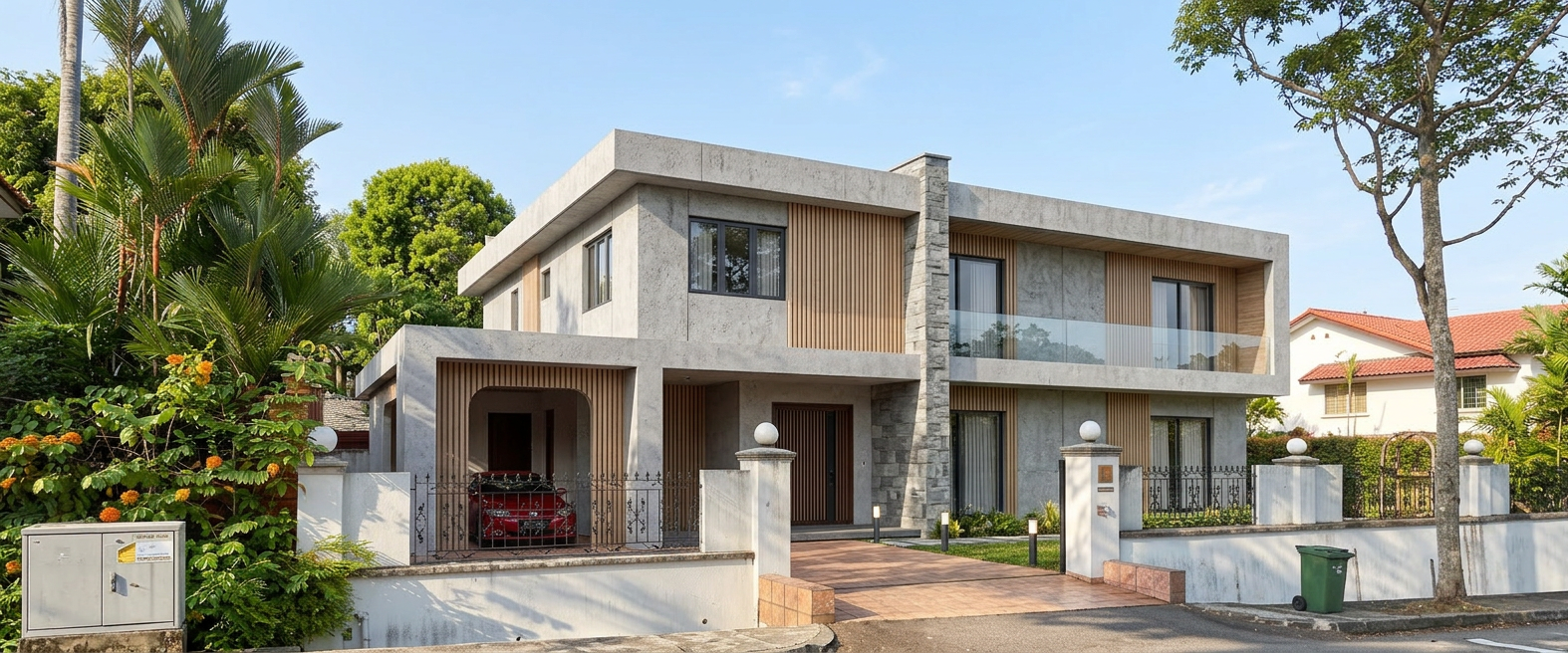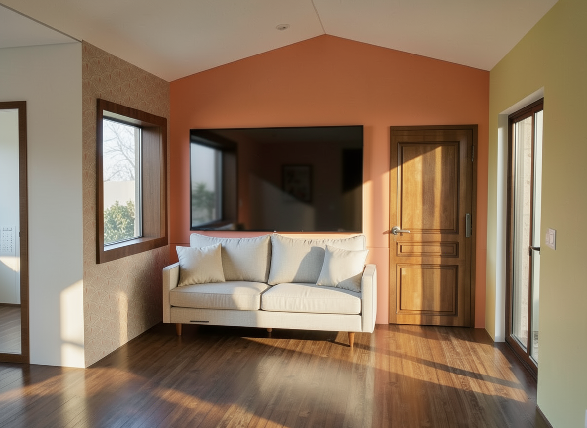 modify the existing image without changing the layout camera angle lighting or overall materials focus only on the suspended wine rack above the bar center of the image second floor wall redesign the wine rack to match the reference it should be wider centered and proportional to the bar below not narrow anymore create a rectangular built in structure framed in wood in the lower portion add a large built in flat screen tv centered above the tv add two horizontal shelves filled with wine bottles at the very top add a third shelf with small decorative plants the structure should feel clean symmetrical and integrated into the wall not hanging thin keep the same wood tone and style as the existing interior modern rustic do not add side cabinets or extensions keep everything within the central structure only keep all windows above the structure exactly as they are