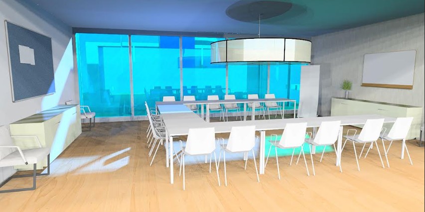 sustainable design interior shot glass has a light blue tint wellness luxury group room warm colors architecture