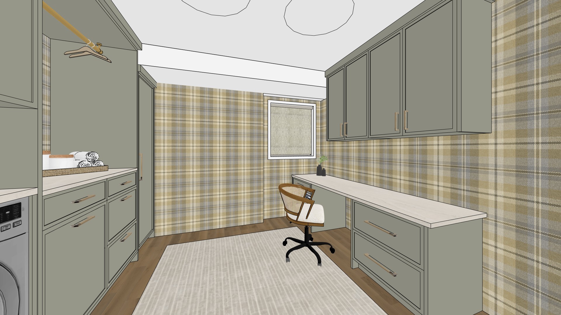ultra realistic interior utility room laundry room rendering shown from a wide angle frontal perspective that captures the full depth of the room including cabinetry on both sides the back wall and the workspace area the room features custom shaker style cabinetry painted in a muted sage green tone with a soft desaturated finish and subtle gray undertones all cabinets have clean recessed panels and are fitted with slim brushed brass bar pulls consistently aligned across drawers and doors on the left side of the room full height cabinetry integrates storage and built in appliances a front loading washer and dryer are partially visible built seamlessly into the cabinetry above and adjacent base cabinets and drawers provide additional storage topped with a light off white solid surface countertop with a smooth matte appearance a brass hanging rod is mounted above the counter holding wooden hangers indicating a functional laundry and garment care zone neatly folded white towels are placed on the counter on the right side a long continuous counter height desk work surface runs along the wall finished with the same off white solid surface countertop below the counter are base cabinets with drawers and above are upper cabinets all in the same muted sage green finish creating a built in workspace or folding station centered along the right wall a desk chair with a woven cane back light upholstered seat and dark rolling base is positioned beneath the counter reinforcing the home office functionality the back wall is fully covered in a plaid pattern wallpaper featuring a classic check design in layered tones of soft beige muted green warm gray and light tan adding texture while remaining cohesive with the cabinetry color a small rectangular window with white trim is centered on the back wall allowing natural light into the room the floor is finished in medium tone natural wood planks laid lengthwise with visible grain a light neutral area rug with subtle linear texture is placed centrally the ceiling is finished in white and is fitted with recessed spot lights spot lighting evenly spaced to provide clean functional illumination throughout the room with no decorative ceiling fixtures lighting is soft even and neutral consistent with architectural visualization standards the overall aesthetic reflects a sketchup style architectural 3d render characterized by clean outlines simplified geometry crisp edges and flat yet realistic materials maintaining accurate proportions and a refined uncluttered composition no elements are added or altered the scene remains fully faithful to the original image and consistent with the harris project palette