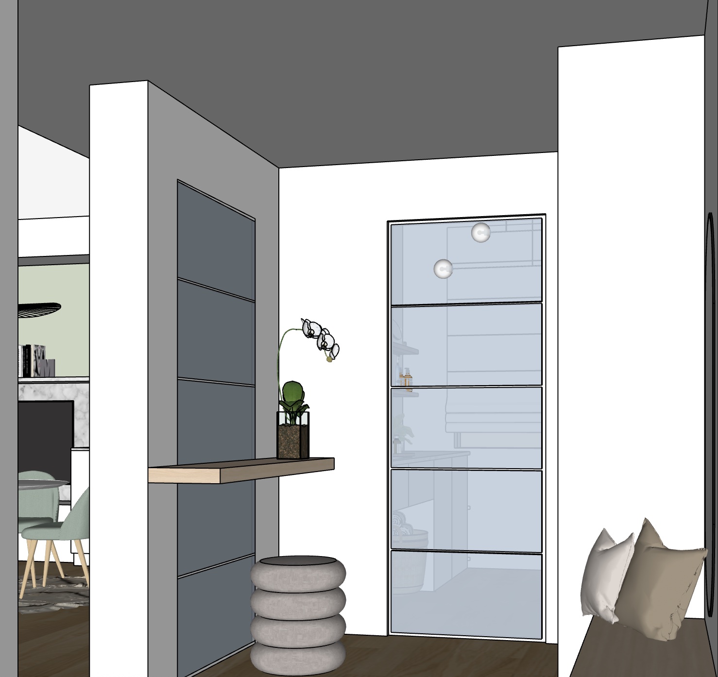 add recessed spotlights into the false ceiling and let some natural light filter through the two glass doors the glass must be opaque so that the bathroom cannot be seen the ceiling is painted white