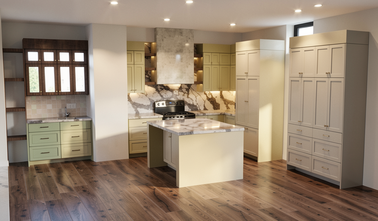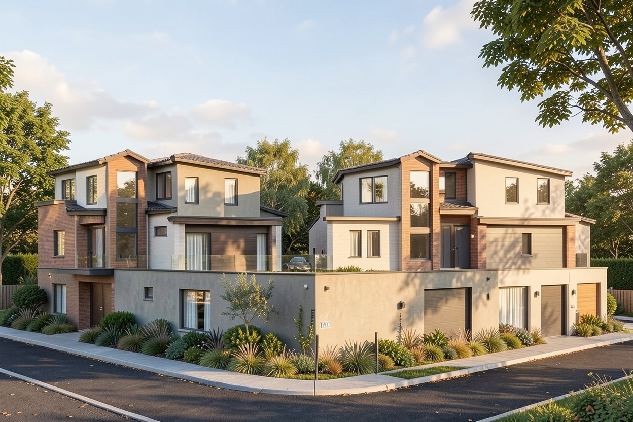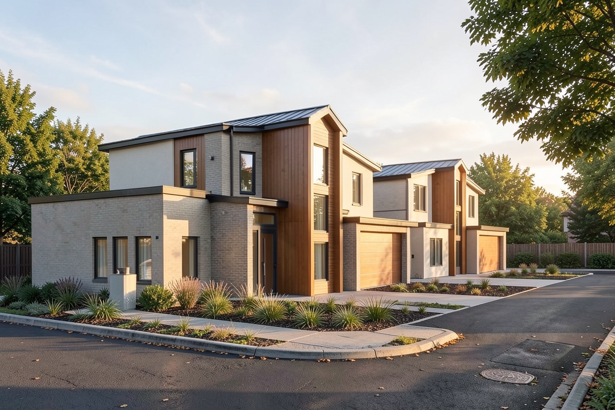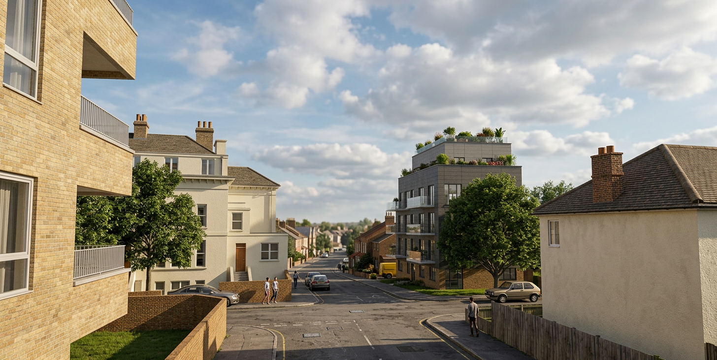 make the cladding to centre right hand building brick and less roof planting keep everything else the same