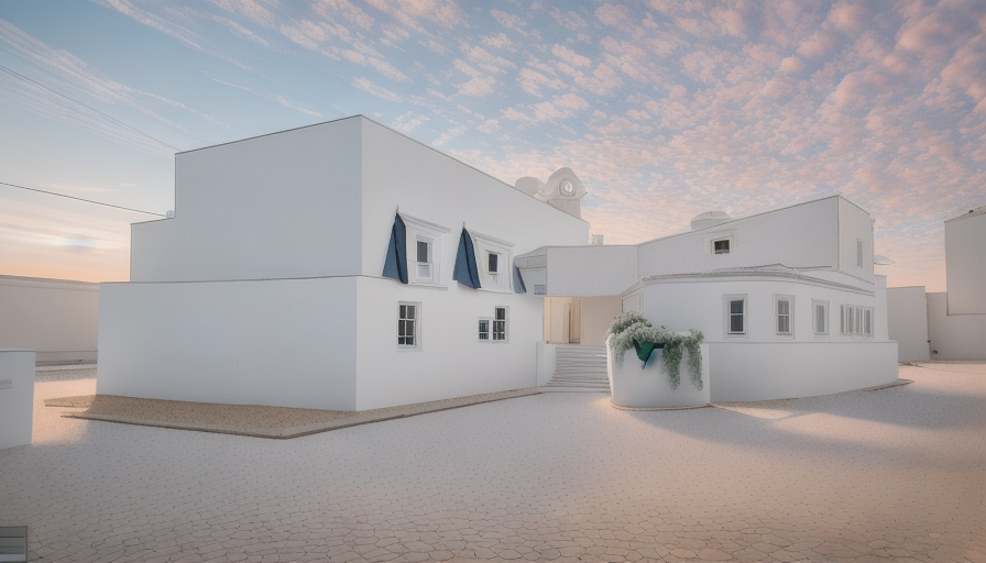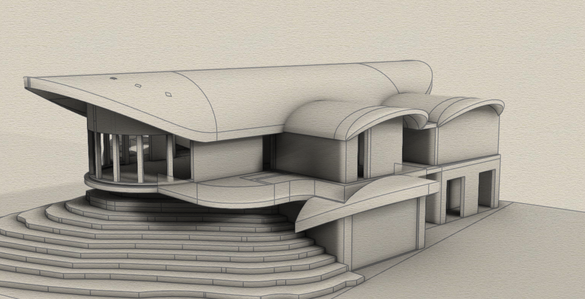 2 story research facility floor to ceiling windows framed with black steel the exterior walls are gray metal panels the roof is black corrugated metal warm light emits from the inside the interior floors are polished concrete off in the distance there are cloudy blue skies and mountains because its so high up fog can be seen below and behinf the building is a forest