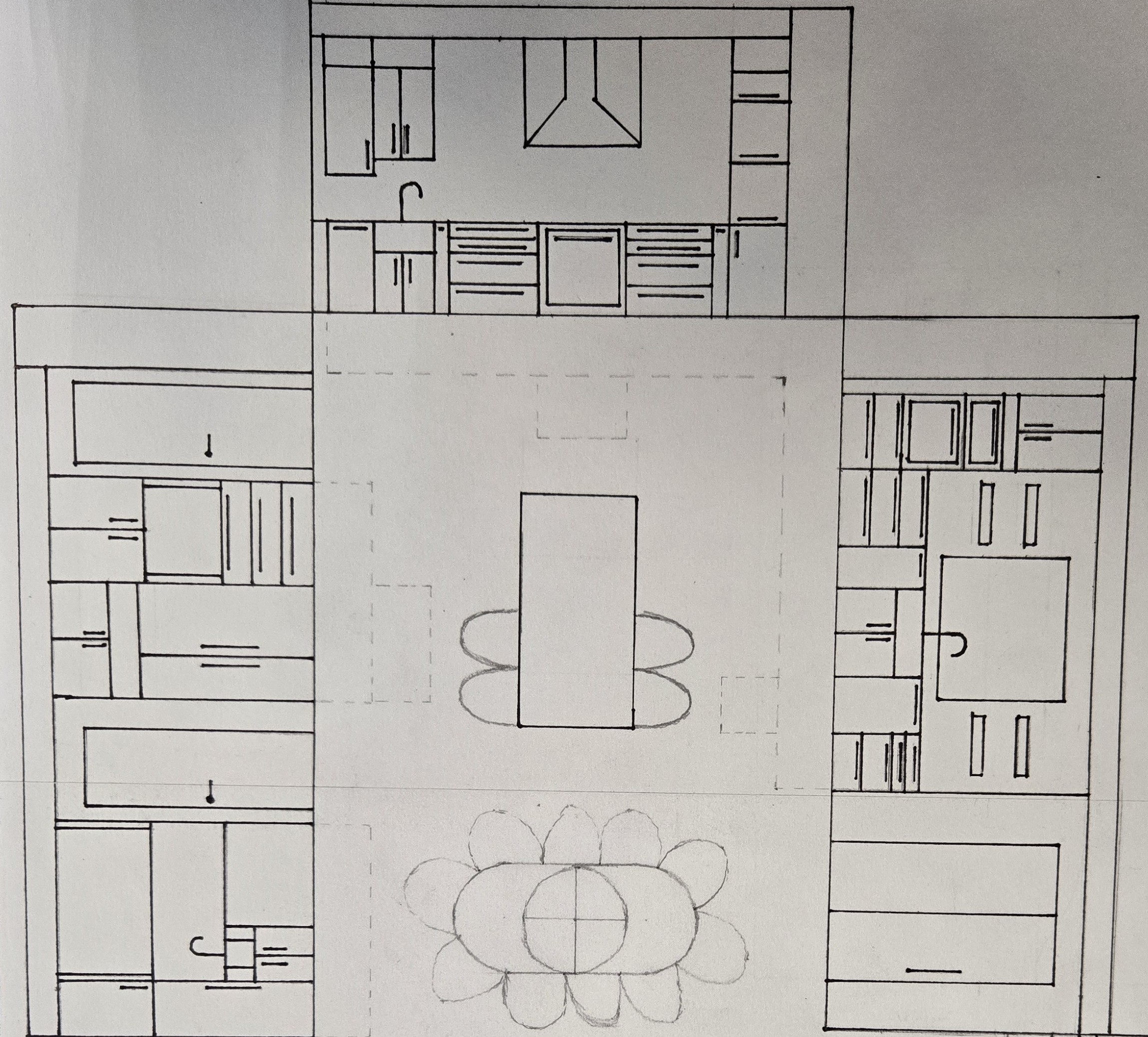 the picture is a kitchen elevation there are three walls forming a u shaped kitchen with an island i will describe each wall going from left to right as if you were facing that wall starting with the wall on the left there is a bar area that includes a full height wine cooler bar sink and counter area above is a pocket door cabinet to store spirits and alcohols next is a door to another room followed by a built in panel ready fridge next to the fridge is a breakfast zone with an appliance garage for espresso machine and toaster on the wall facing the island is a food prep sink induction oven with range and appliance garage the wall on the right starts with a wall microwave oven combo following by the main sink that has a large window directly above it at the end of the this wall is a sliding patio door generate a realistic 3d rendering with a modern organic design counter tops should be a beige quartz with some brown veining and floors a white oak engineered hardwood the cabinets should be a medium brown wood color