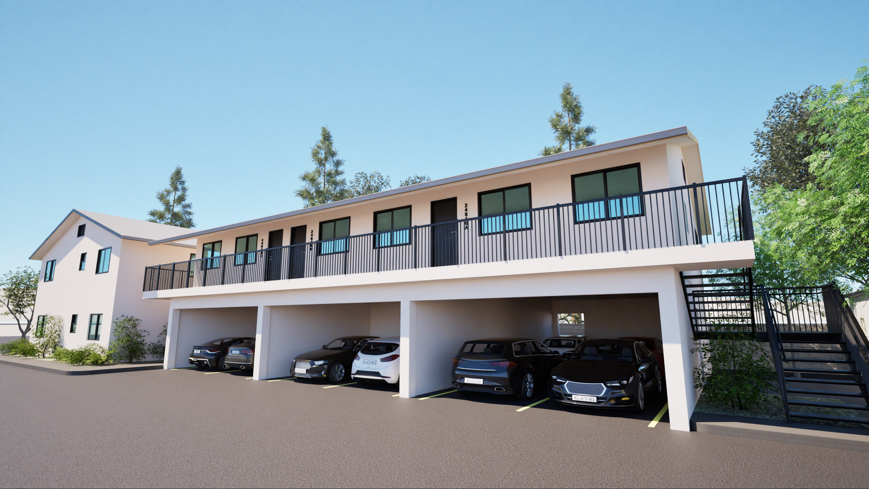 smooth white stucco wallks black metal railings and roof gutters black stairs old asphalt paving sunny weather with some clouds