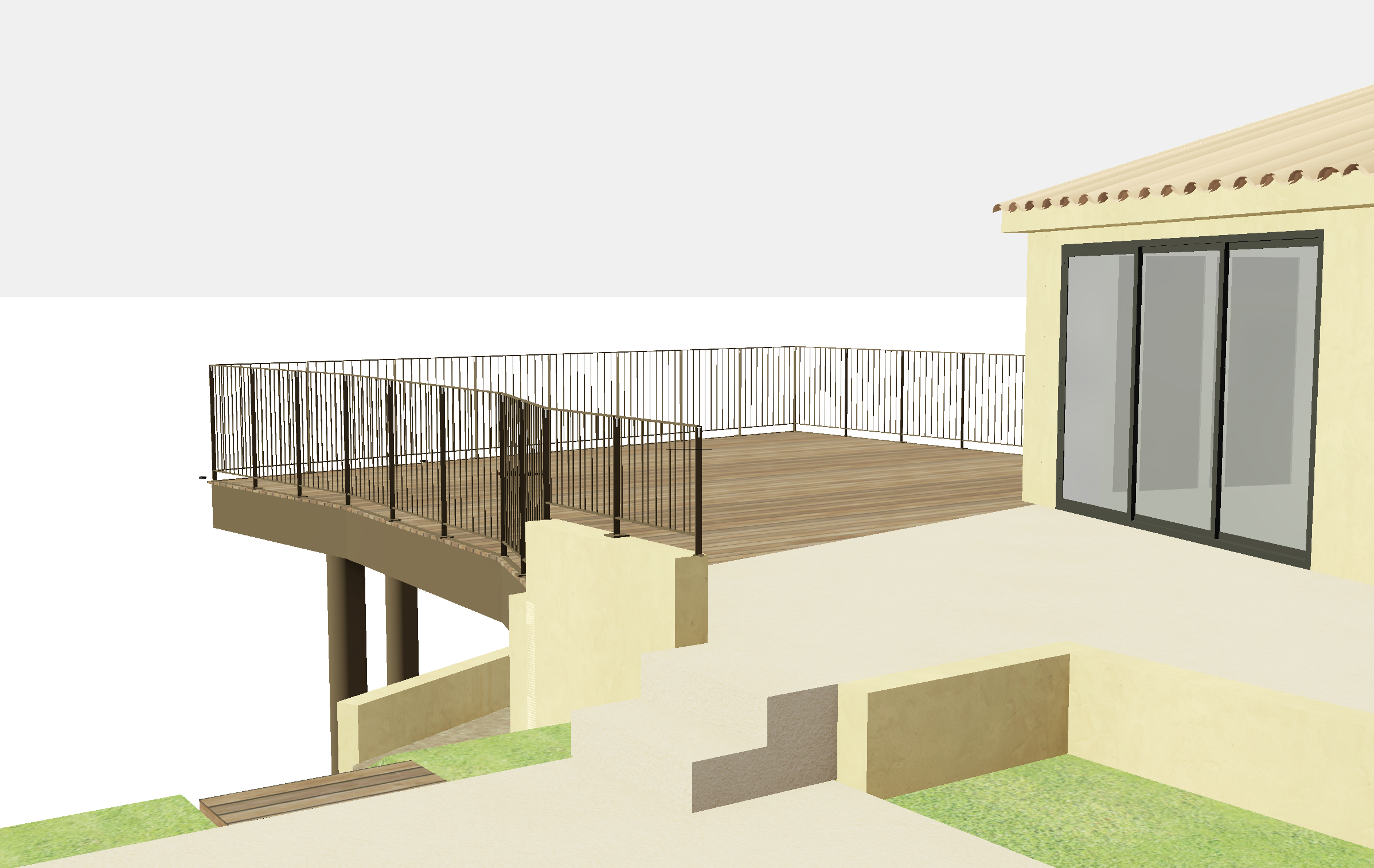 add a lot of pine trees and oak trees it s in a forest in the south of france there is a slender oak tree crossing the terrace on the left of the terrasse add a slender oak tree crossing the middle of the terrace the oak tree is in the middle of the wood terrace the terrace in the background is in portuguese cobblestones