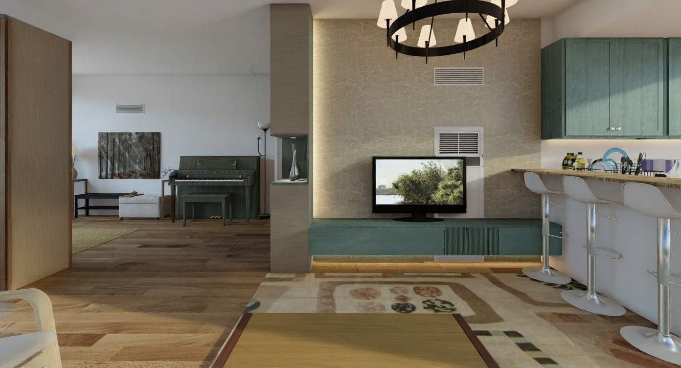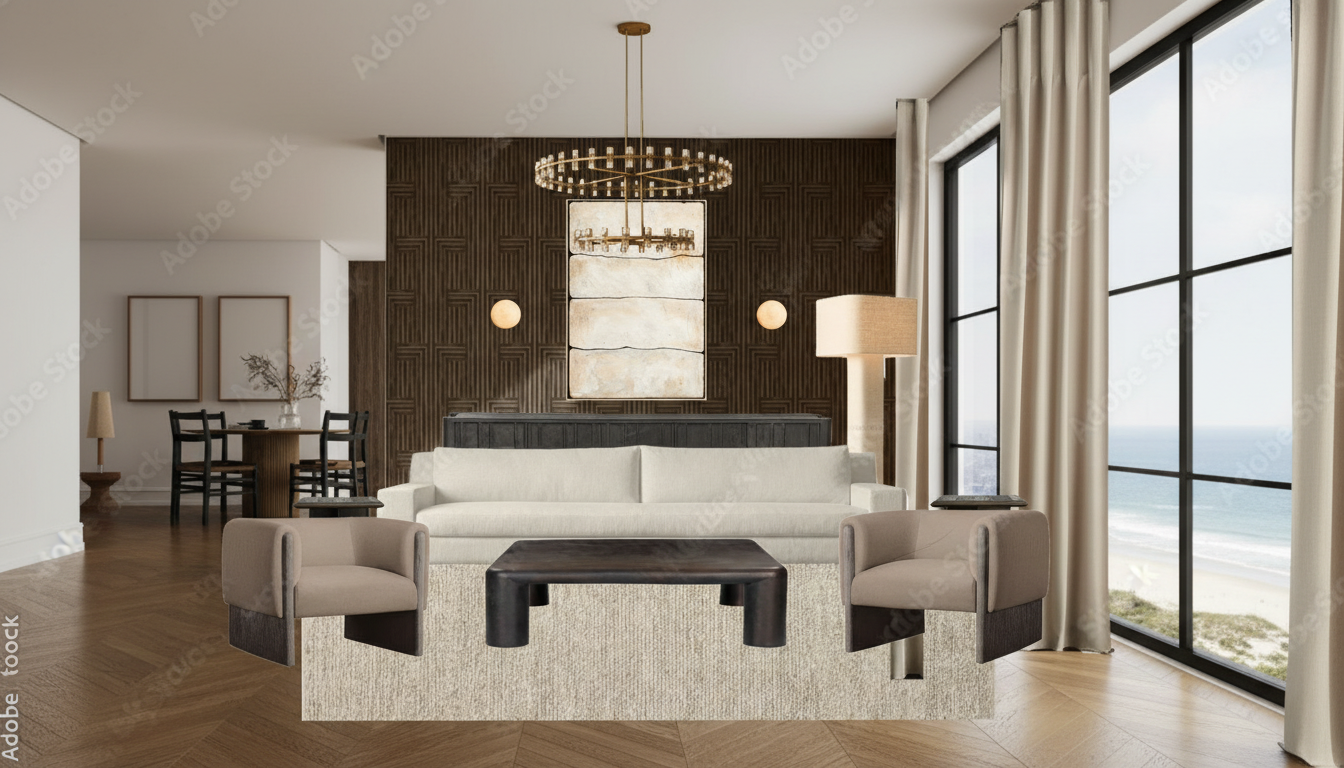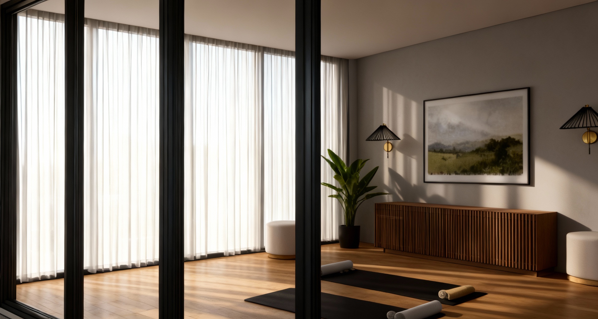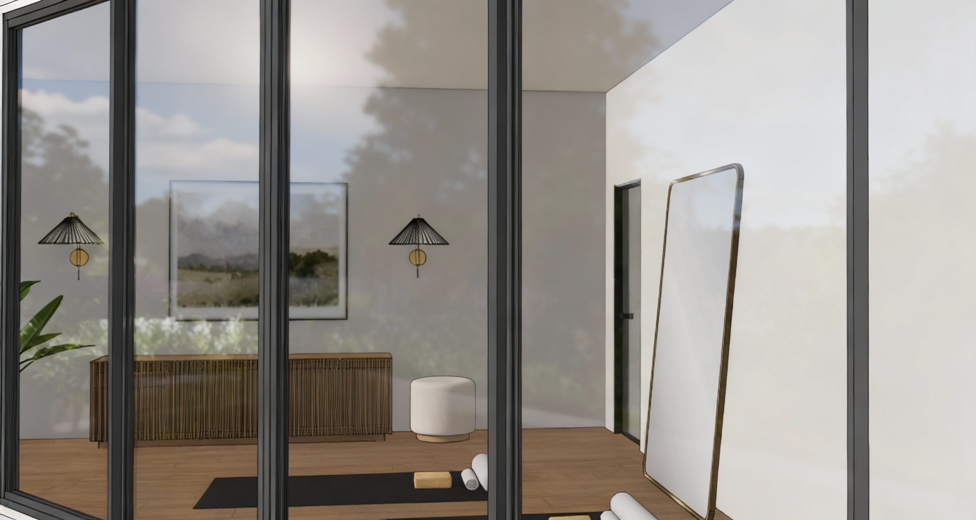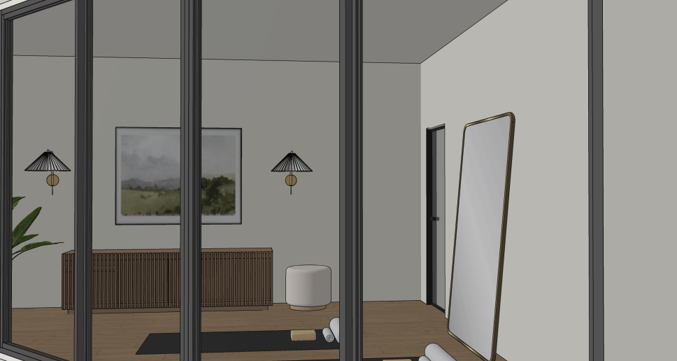 render this scene as a photorealistic exterior to interior view through the curtain wall do not change any colors materials finishes furniture or proportions inside or outside the room keep the black aluminum curtain wall mullions exactly as shown the warm wood flooring the soft grey walls the brown slatted console the black and brass sconces the large white floor mirror the yoga mat and props the pouf and the wall art exactly as they appear maintain the exact camera angle and layout enhance realism by showing natural daylight outside and soft diffused light entering the room add subtle reflections on the glass but keep visibility clear enough to see the interior slightly blur the exterior background to suggest sky and greenery without changing the design only improve lighting behavior reflections shadows and material depth while keeping all existing colors and materials completely unchanged