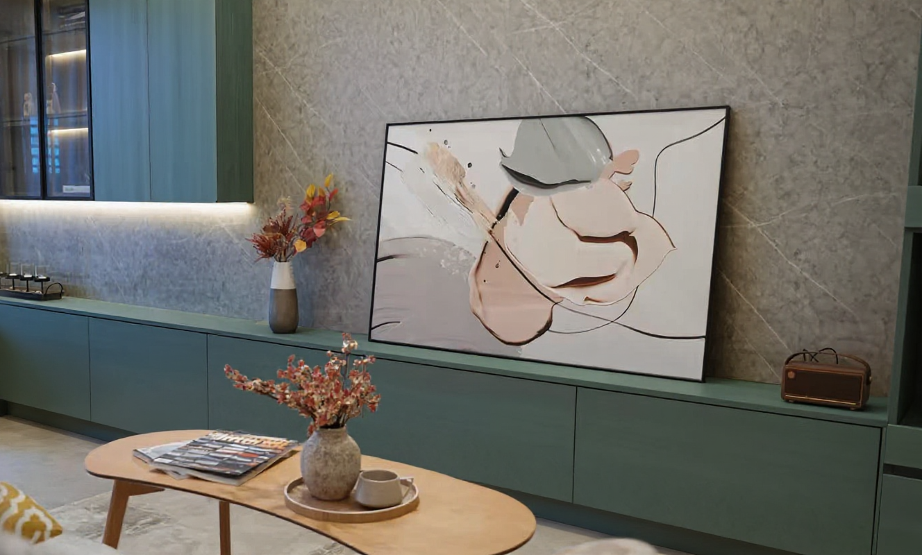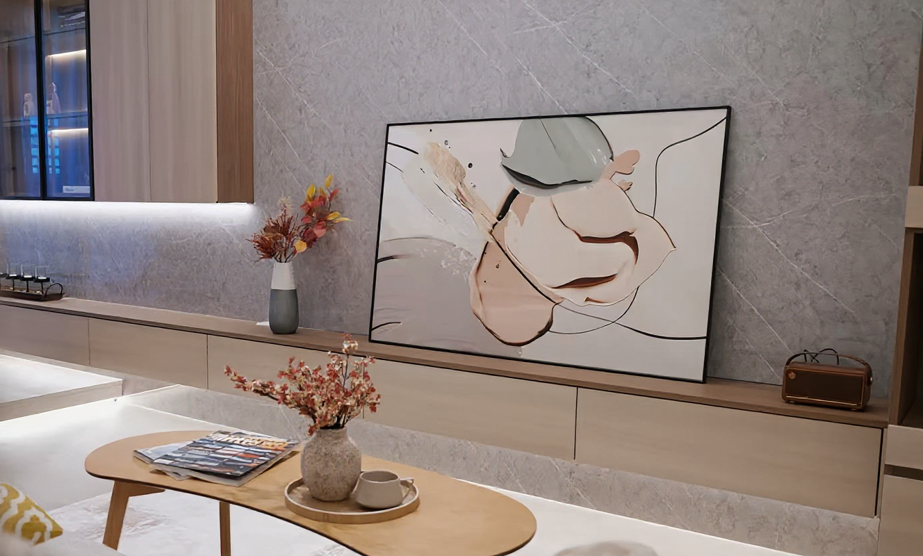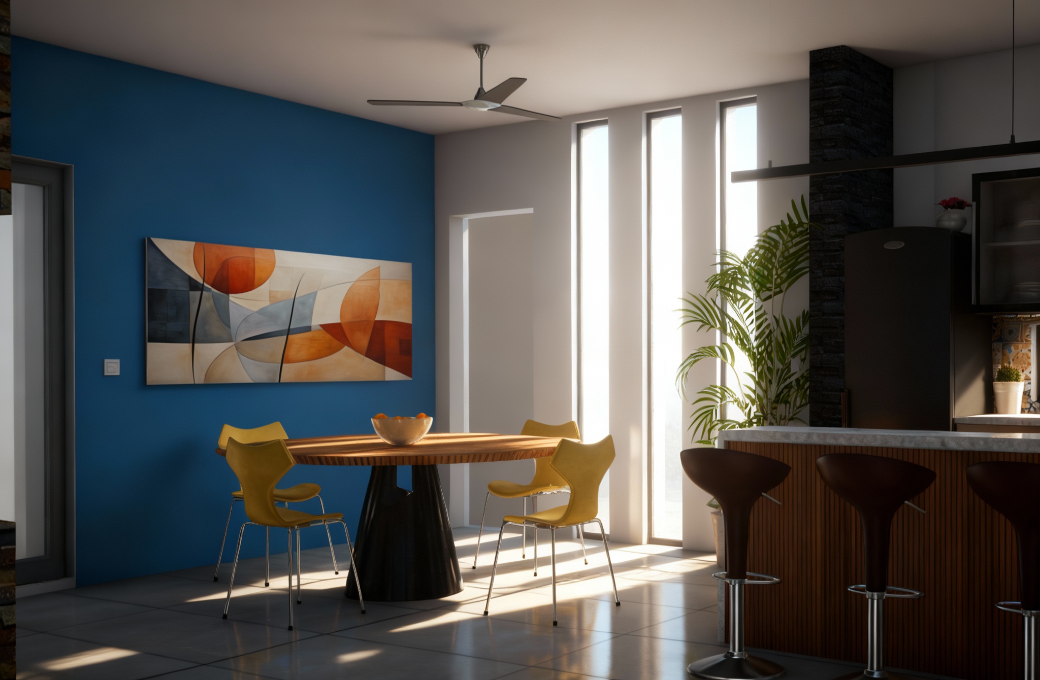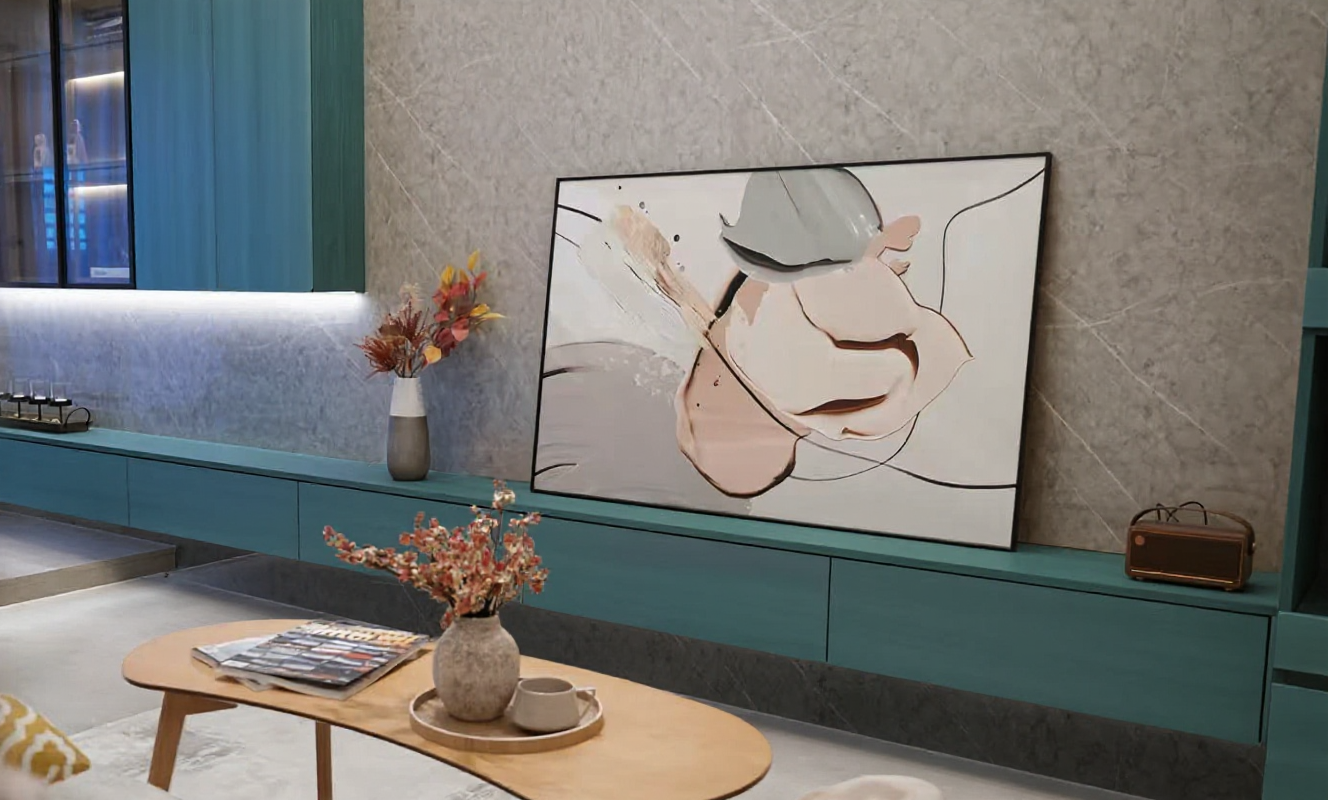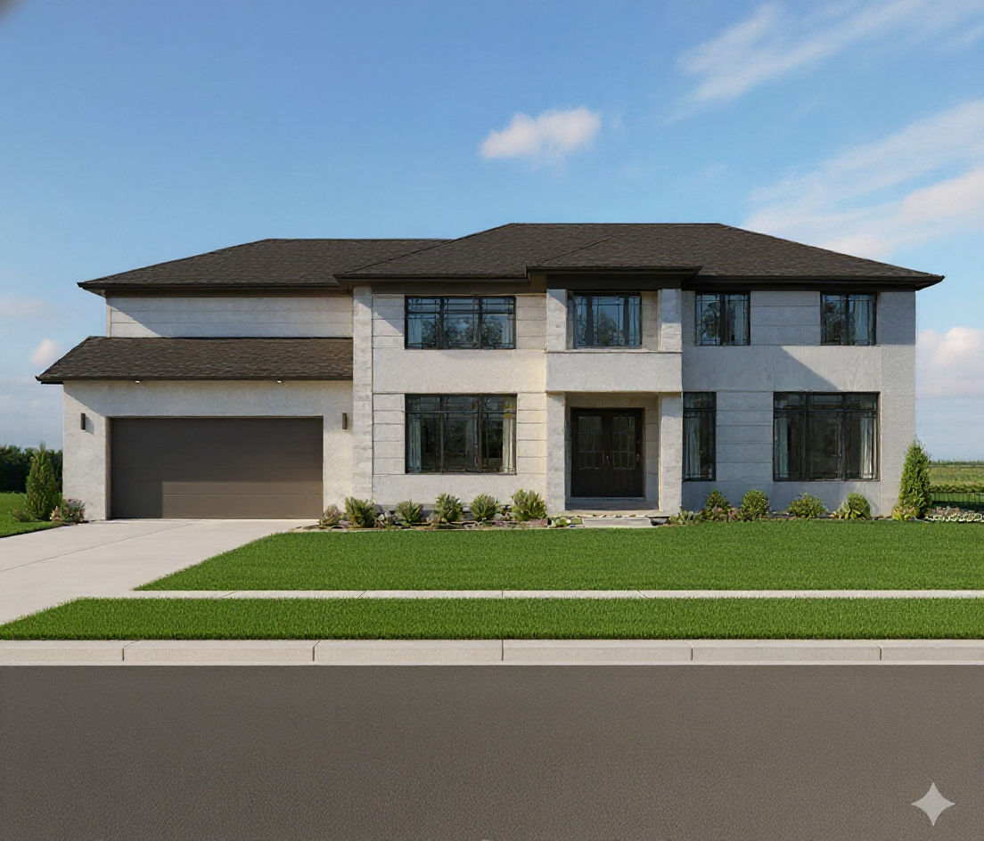 render this scene as a photorealistic exterior to interior view through the curtain wall do not change any colors materials finishes furniture or proportions inside or outside the room keep the black aluminum curtain wall mullions exactly as shown the warm wood flooring the soft grey walls the brown slatted console the black and brass sconces the large white floor mirror the yoga mat and props the pouf and the wall art exactly as they appear maintain the exact camera angle and layout enhance realism by showing natural daylight outside and soft diffused light entering the room add subtle reflections on the glass but keep visibility clear enough to see the interior slightly blur the exterior background to suggest sky and greenery without changing the design only improve lighting behavior reflections shadows and material depth while keeping all existing colors and materials completely unchanged