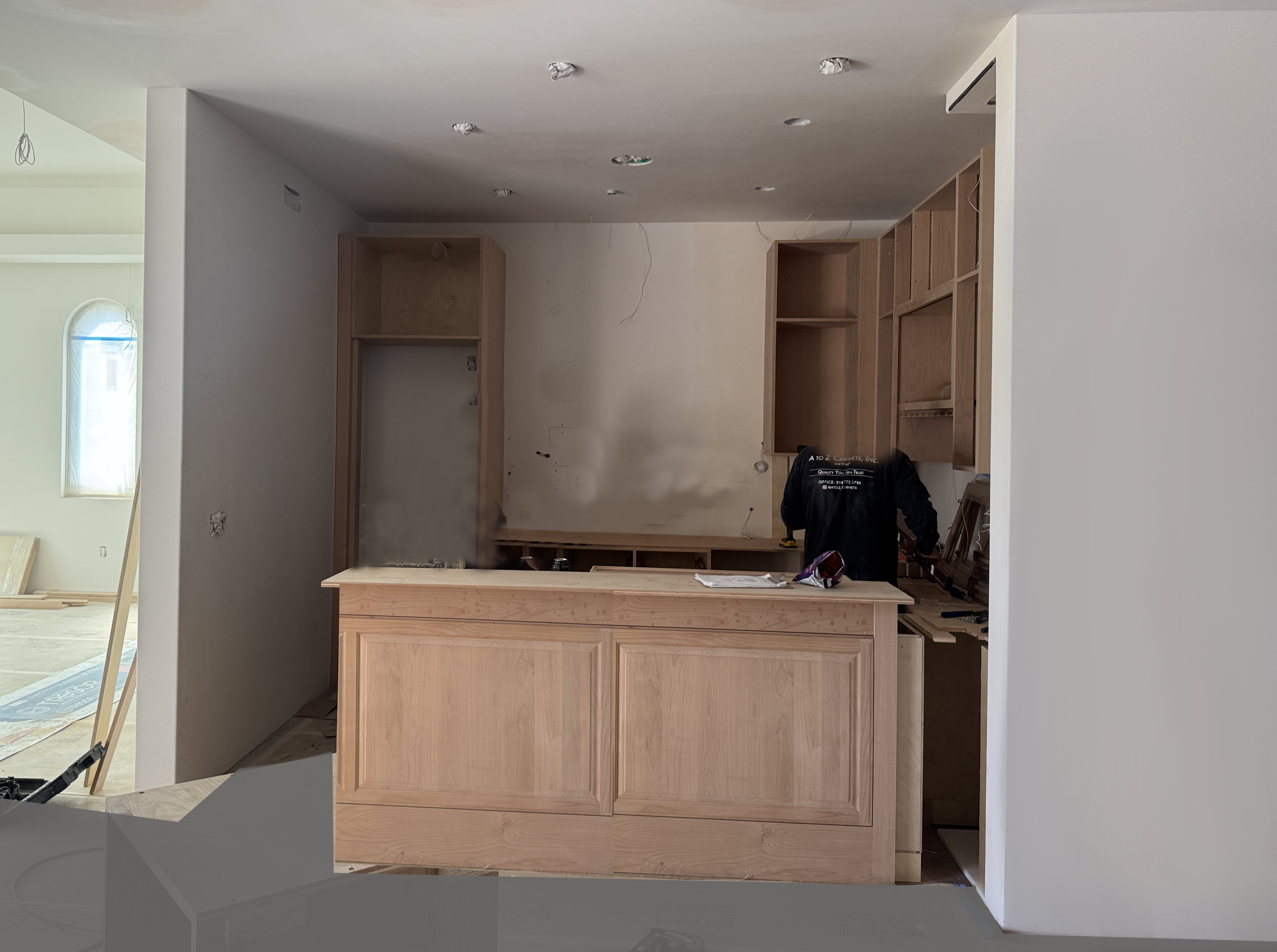 design a wet bar area with warm oak cabinets with mirrored front panels add ivory textural barstools with arms in front the floor is a medium tone oak wood plank the lighting is sunlight the lighting is also ambient lighting underneath the upper cabinets