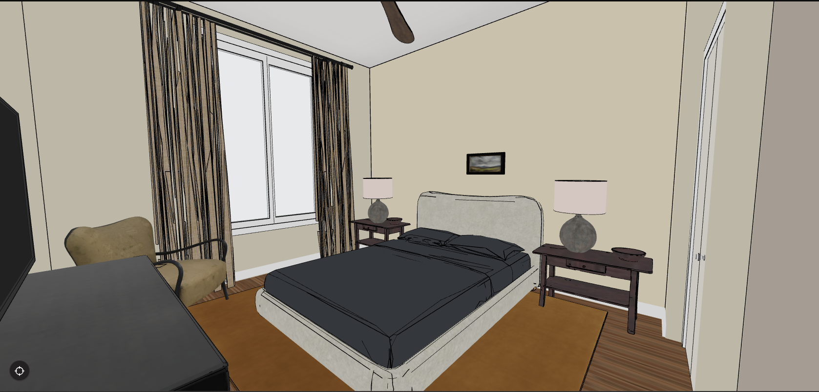 create a render in hyper realistic architectural visualization quality 8k resolution all objects furniture and architectural features must remain in place do not add any objects or delete anything from the image the spatial configuration must remain unchanged warmth gentle reflections soft shadows enhanced color richness and luxurious level realism improve depth and realism through wood grain richness brass highlights fabric texture and polished clarity while keeping the entire scene exactly as originally designed use light from the lamps next to bed and use general daylight lighting in the room the walls ceiling and trim all in farrow and ball s school house white this is a north light facing room floors are a medium wide plank oak the bowls on the bed sidetables are a mistake don t need to include those vibe should be minimalist warm editorial like the antique tables are antique