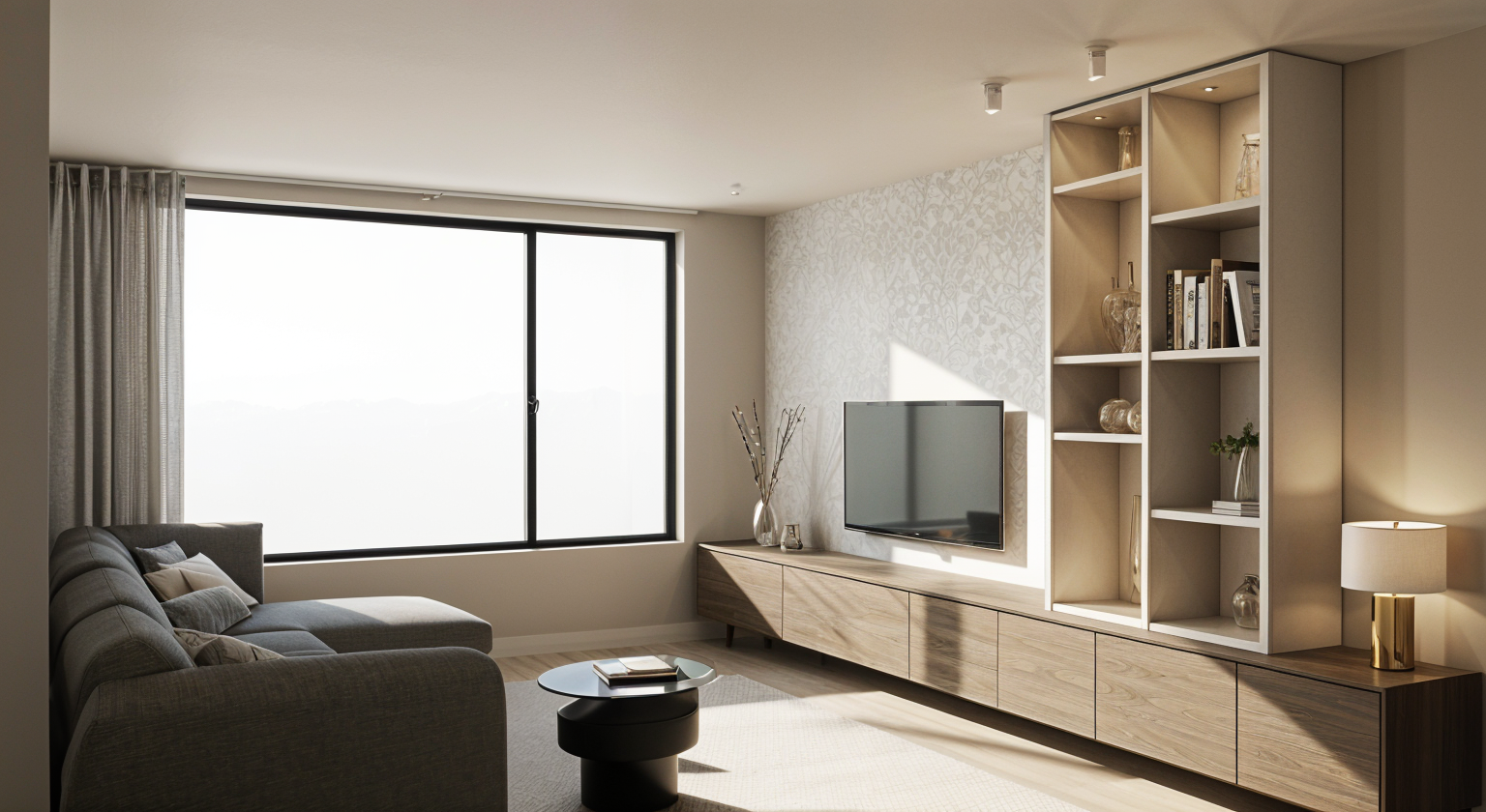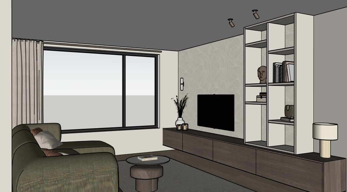 make the sofa dark sage green the spotlights bronze and outside show a street in a village