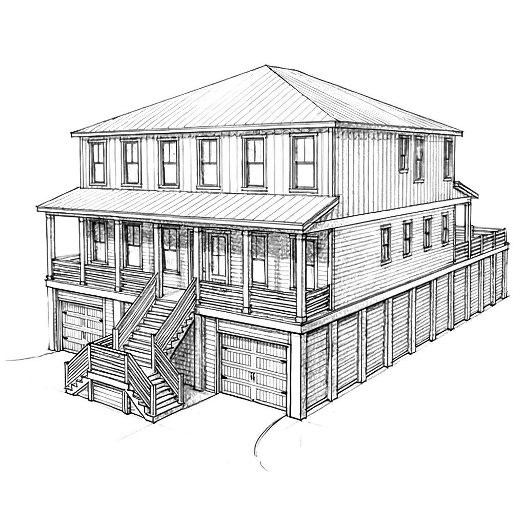 the house should have a white exterior with a silver metal roof and palm trees should be placed so that they do not overly block the view windows should be black the railings at the back should be metal horizontal black the front railings and staircase should be white garage door should be white front doors are double french 3 4 light medium brown stain