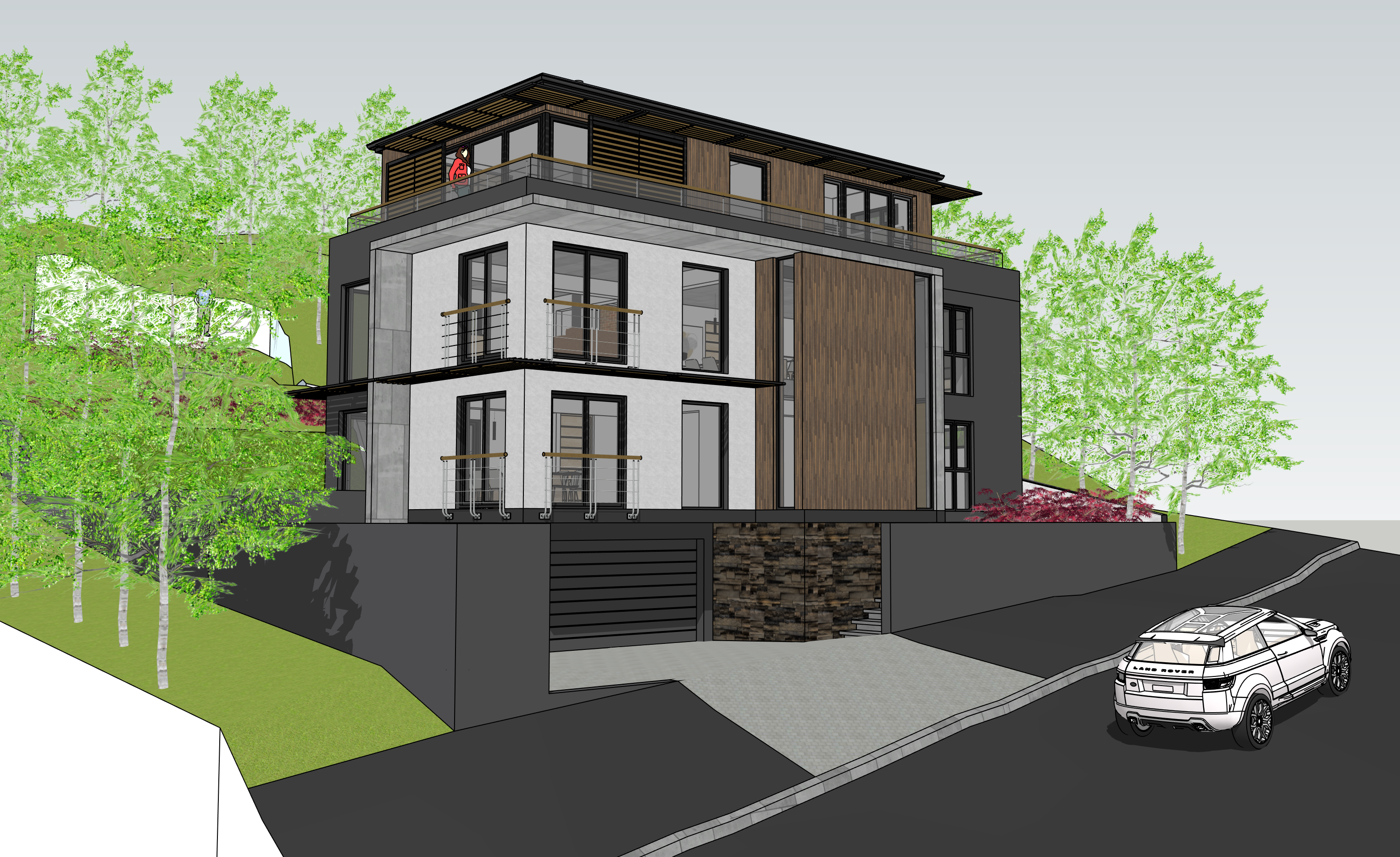 exterior shot a modern luxurious three story urban villa surrounded by lush vibrant green trees the building features sleek gray exteriors contrasting with rich wooden accents on the upper floors the large glass windows are framed in dark metal reflecting a clear blue sky the driveway and garage area are paved with light gray tiles complementing the dark gray of the retaining walls a stylish white suv with black rims is parked at the entrance the atmosphere is serene and sophisticated set in a tranquil upscale neighborhood with a soft golden sunset casting warm hues across the scene architecture