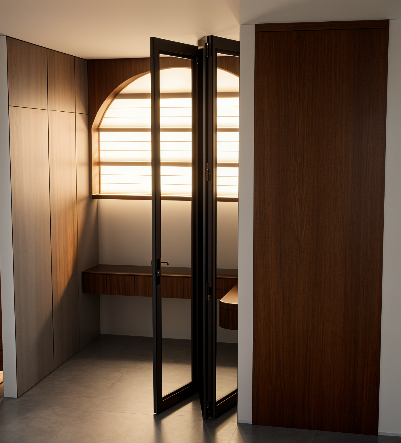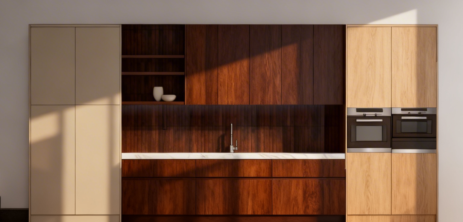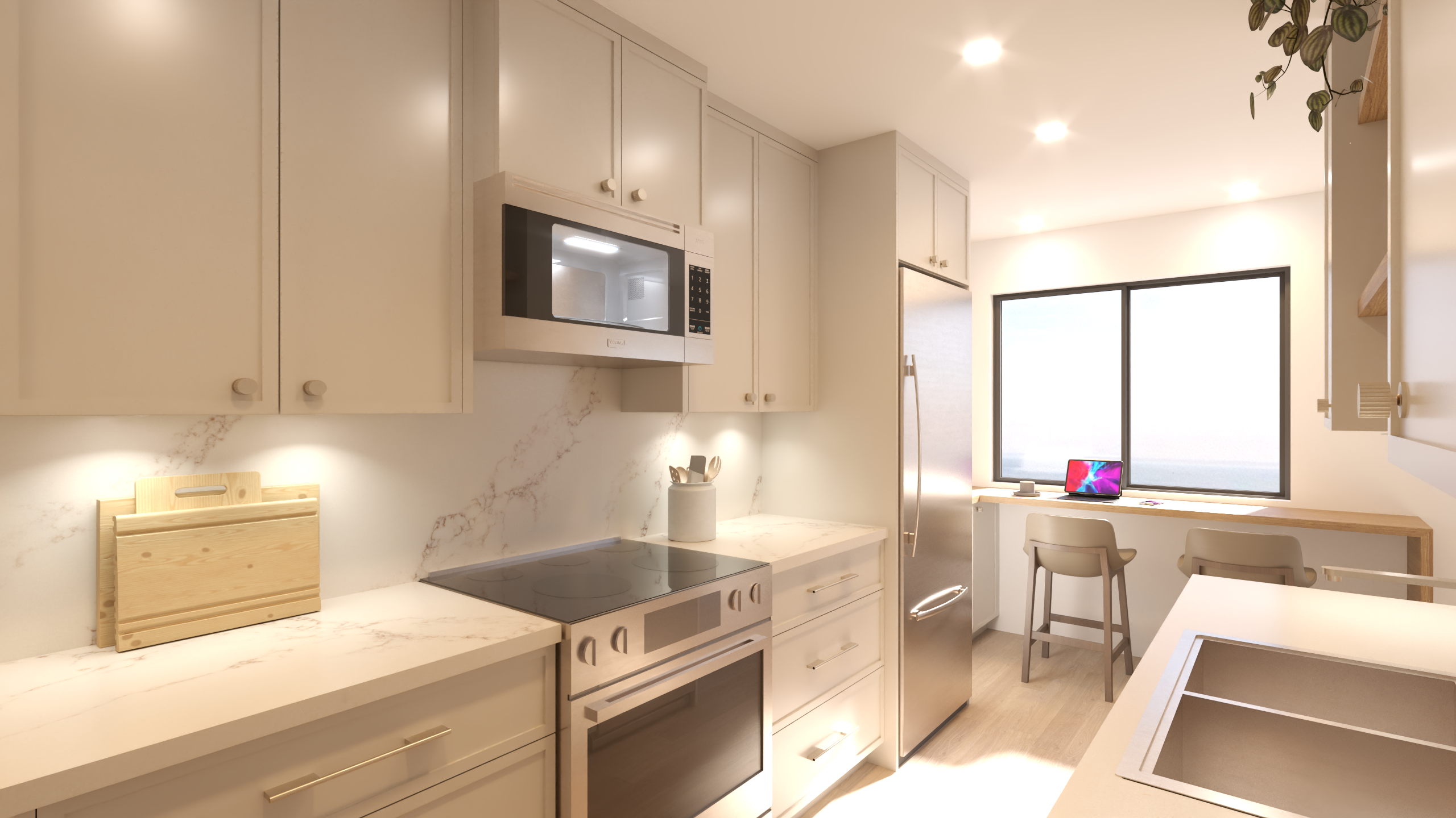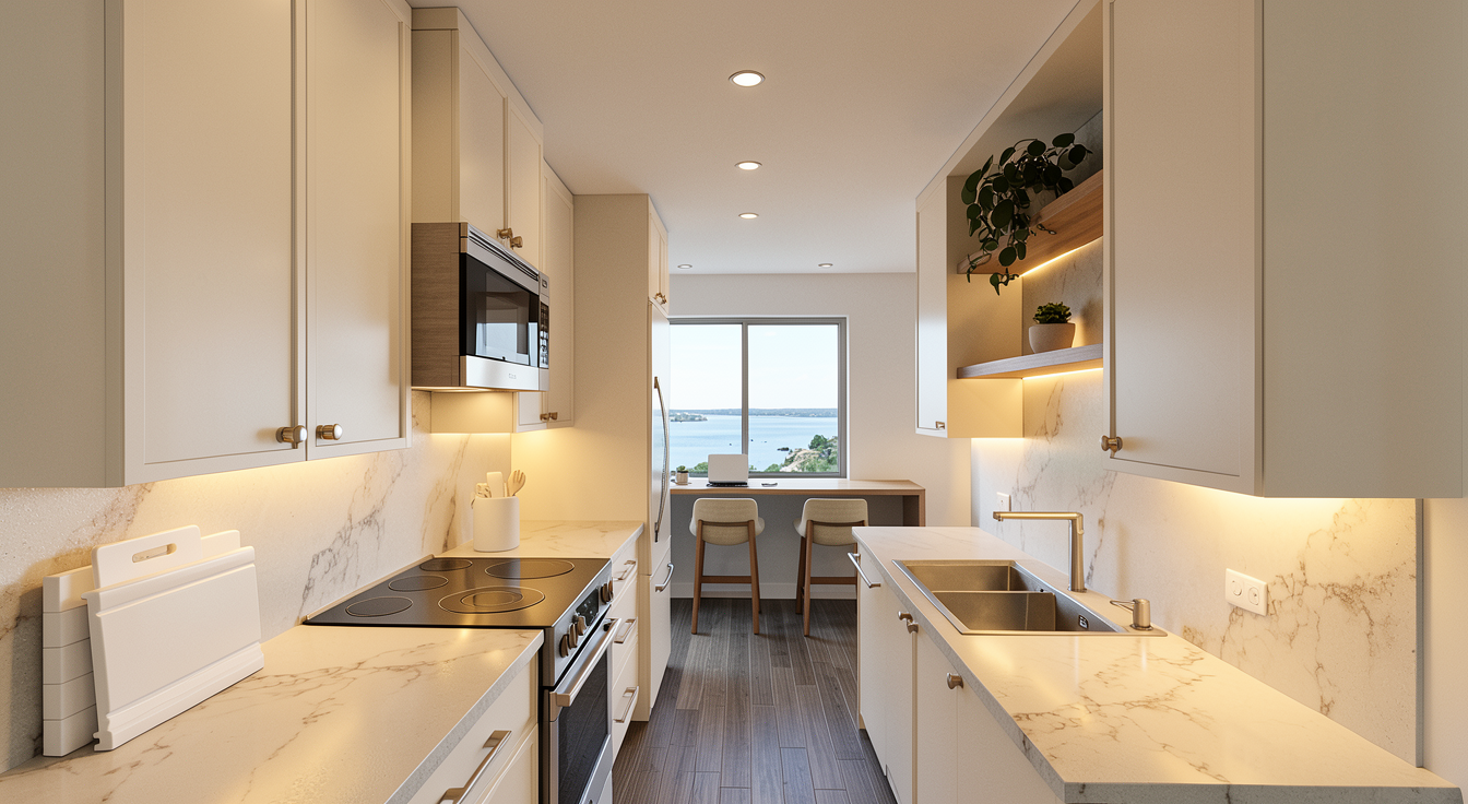 do not change the structure or model keep original texture a modern minimalist interior featuring a sleek warm white cabinet with clean lines add warm tone undercabinet light background view is from 7th floor looking over lake no island
