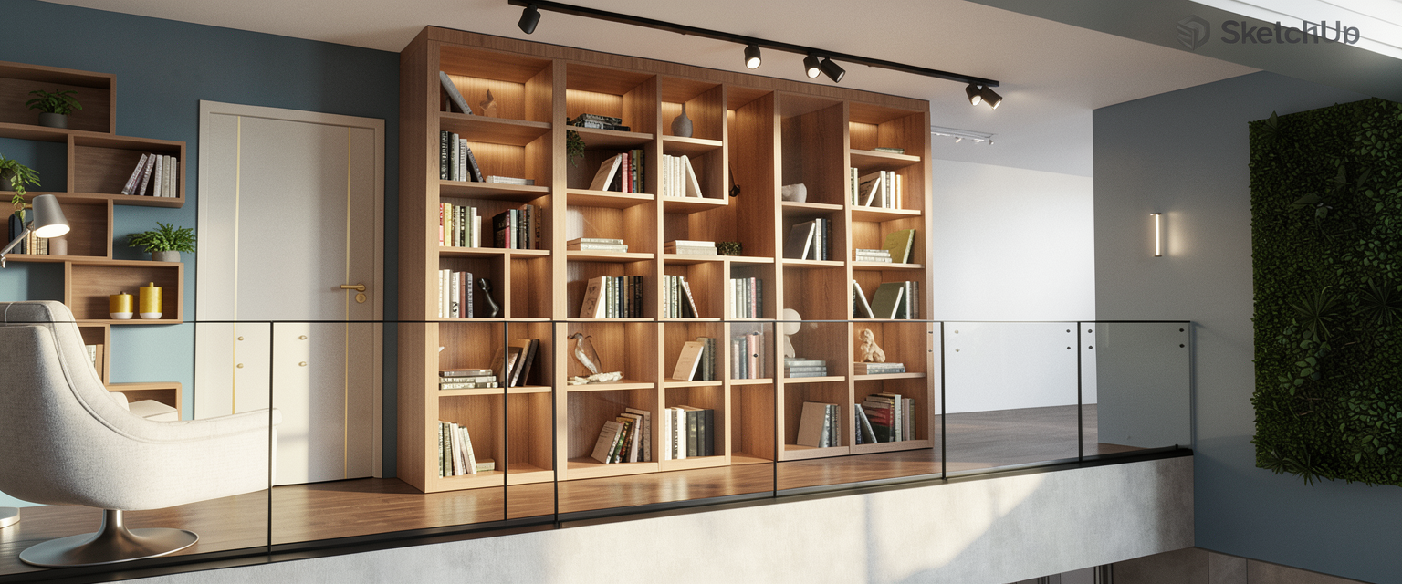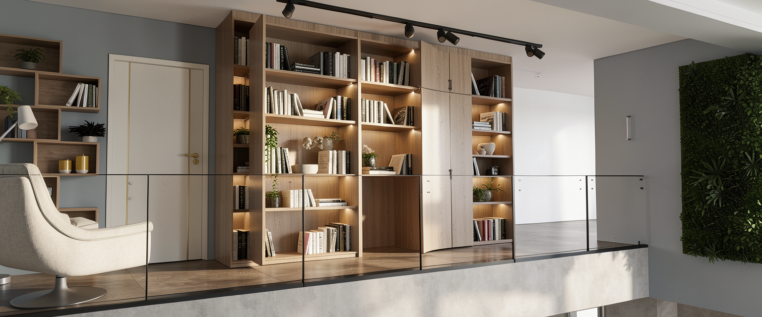 and small desk under the shelves