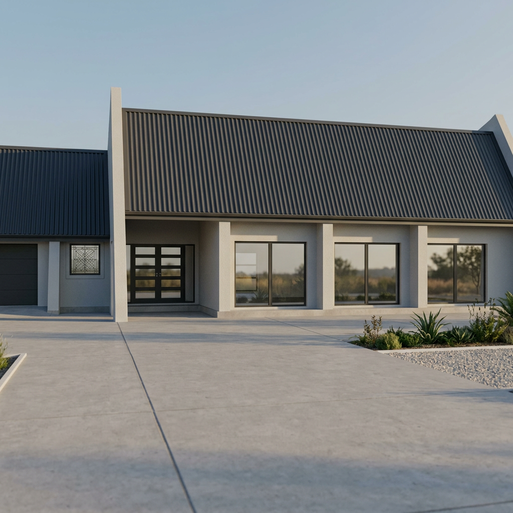 modern with terraced patio areas lots of grass and plants put frutniture inside the house