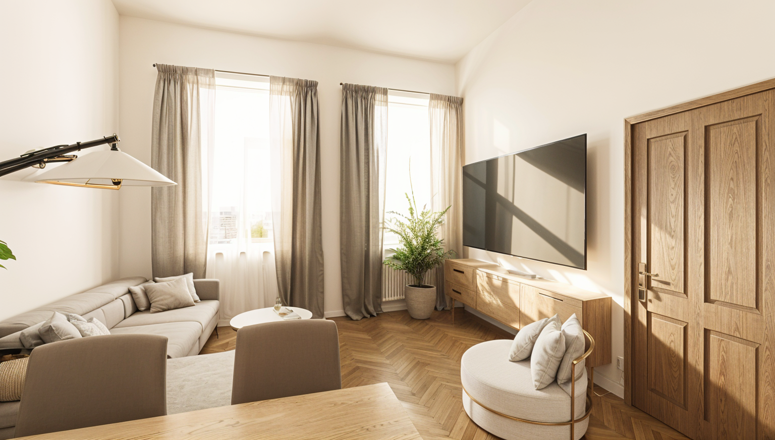 make this render more realistic dont change the colors and the shapes dont replace the standing lamp next to the sofa