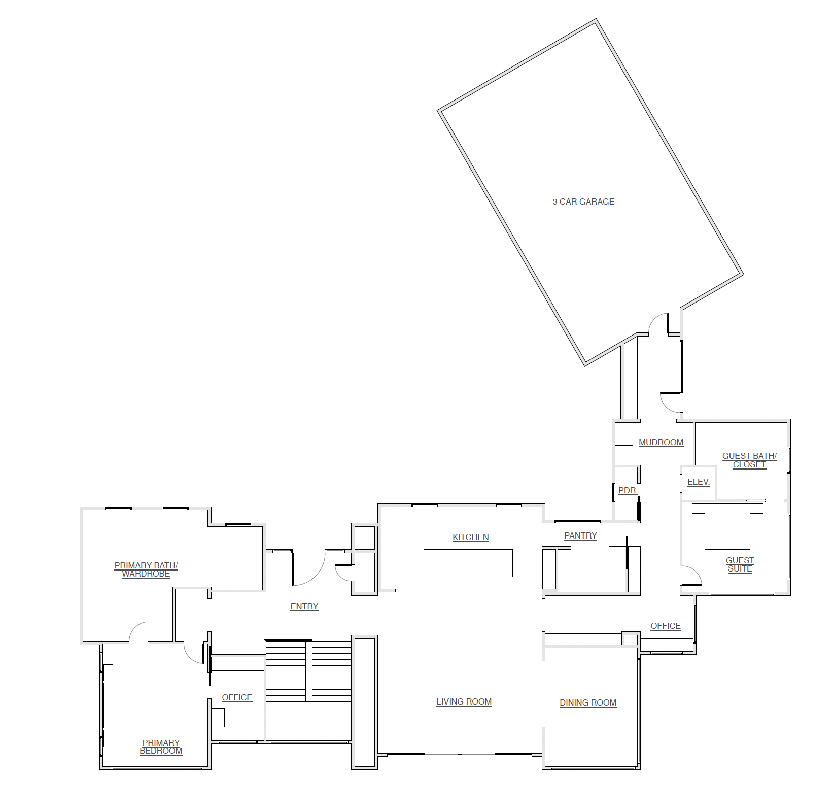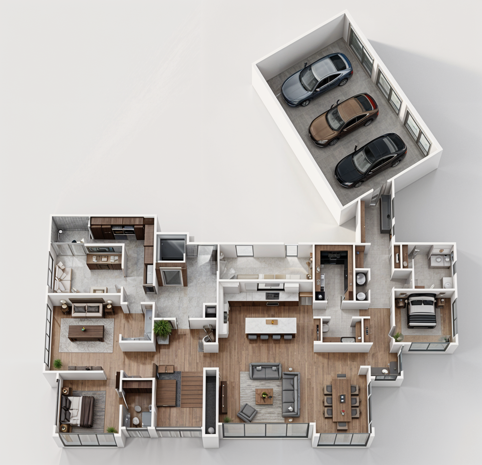 convert this floor plan into a realistic isometric 3d view of a full house show the space from an elevated angle with furniture walls and details visible minimalist grays and brown tones with the furnishings white walls with large floor to ceiling windows use the same furniture as shows on the plan do not change the orientation of the floorplan