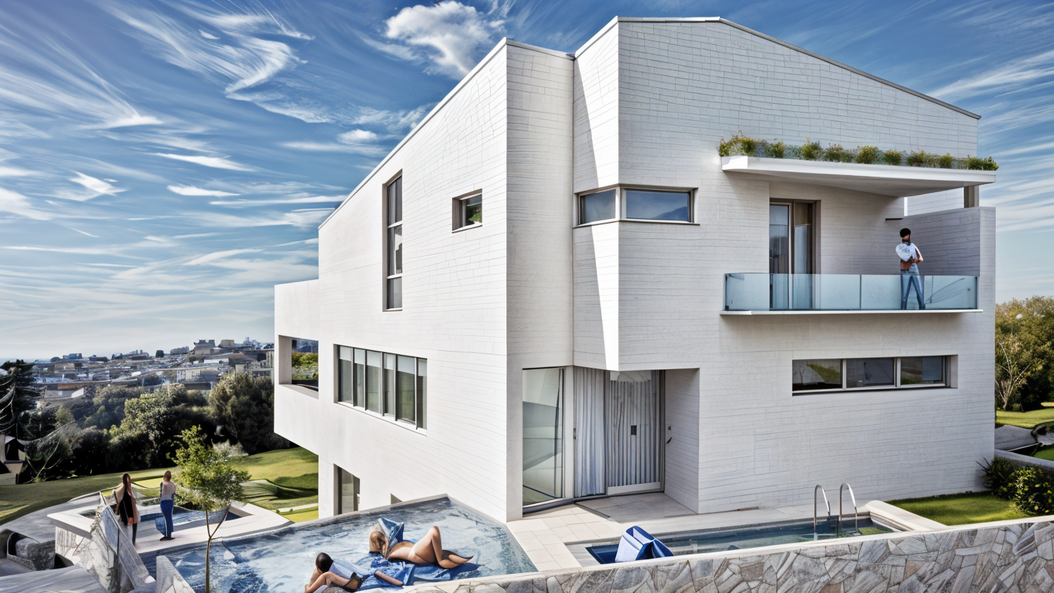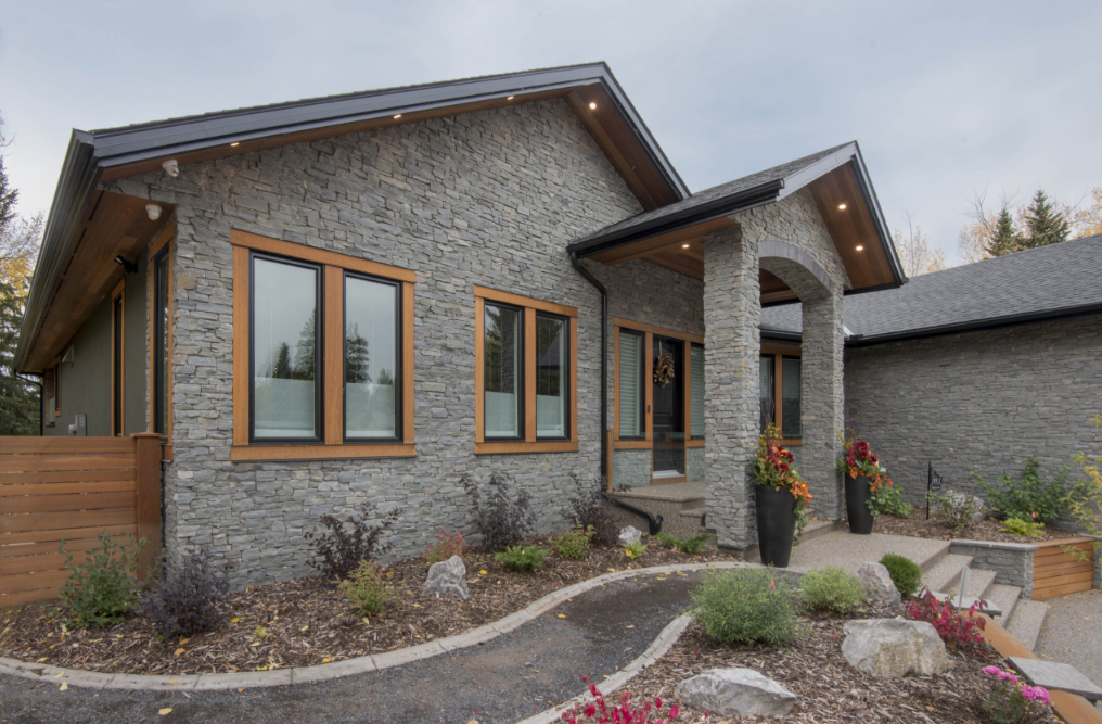 modernist interior shot older bc home exterior with wood lap siding painted in muted blue white window trim slightly weathered look surrounded by cedar trees cloudy sky realistic west coast atmosphere architecture