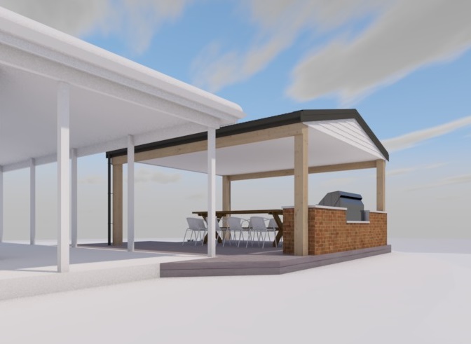 gardens around the outdoor canopy keep original building white show brick veneer on bbq units