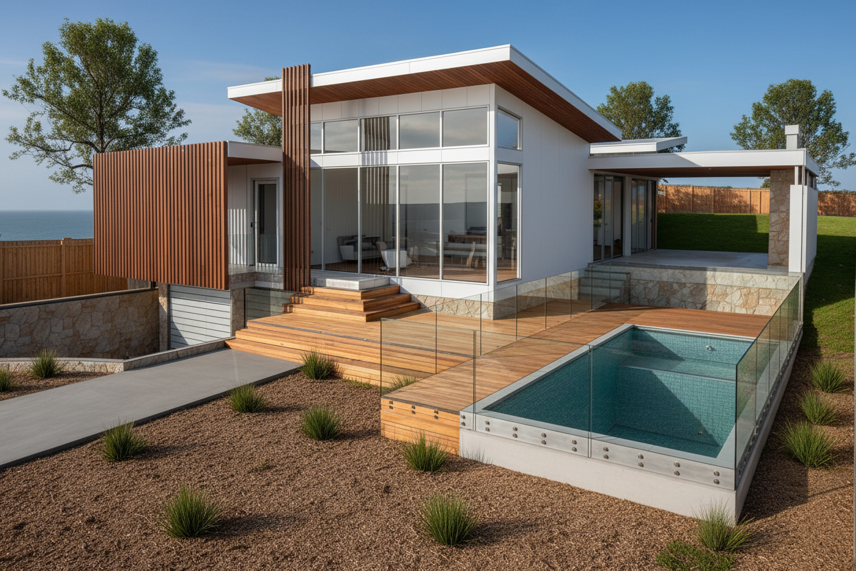 interior shot of kitchen and living room valuted ceilings with recessed light balanced with natural light from windows all wall are soft white with matte finish counter top is white as well with grey matte kitchen appliances flooring is engineered wood its mid day with light coming in from recessed lighten