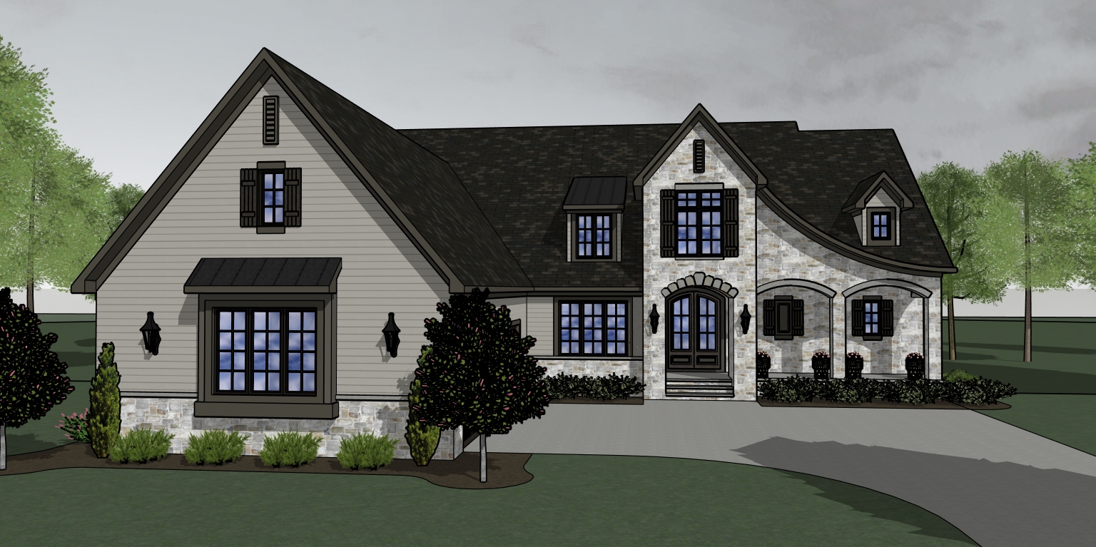 partly cloudy sky some deciduous trees in background add gutters and downspouts