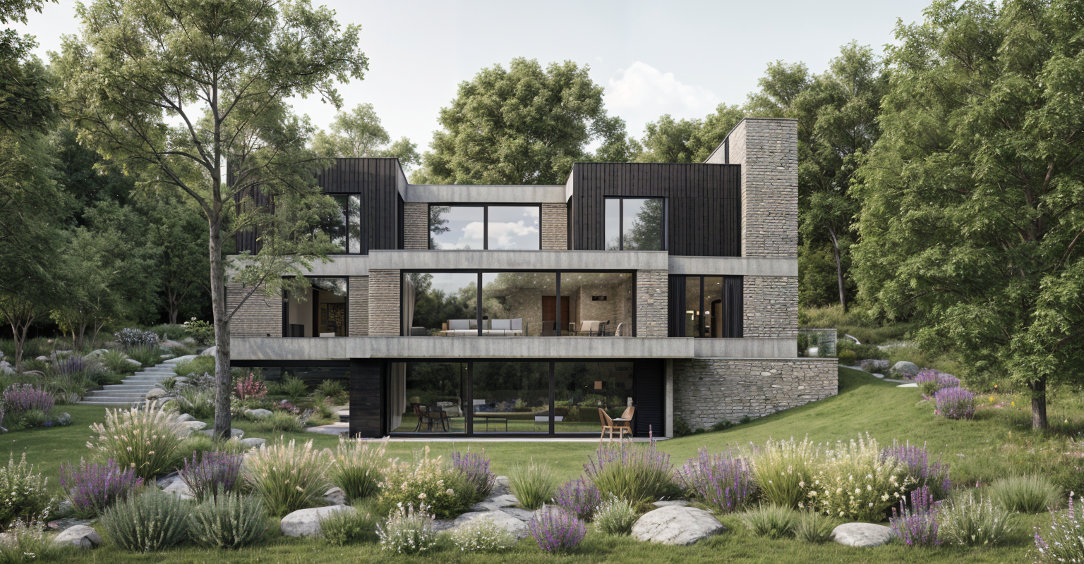 exterior shot dark grey plaster light beige plaster sun daulight with strogn shadows architecture
