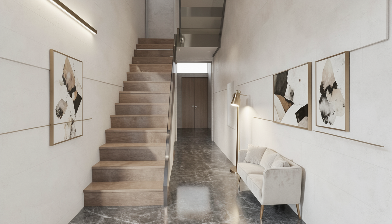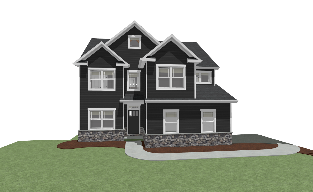render this 3d image to appear photo realistic maintain all existing architectural materials and structural elements exactly as shown enhance the setting with a lush well maintained landscape include minimal beds manicured shrubs and a tree lined backdrop that frames the home naturally the windows should have a glossy finish with clear reflections of the surrounding trees and sky lighting should feel natural with soft shadows and realistic depth to bring the scene to life