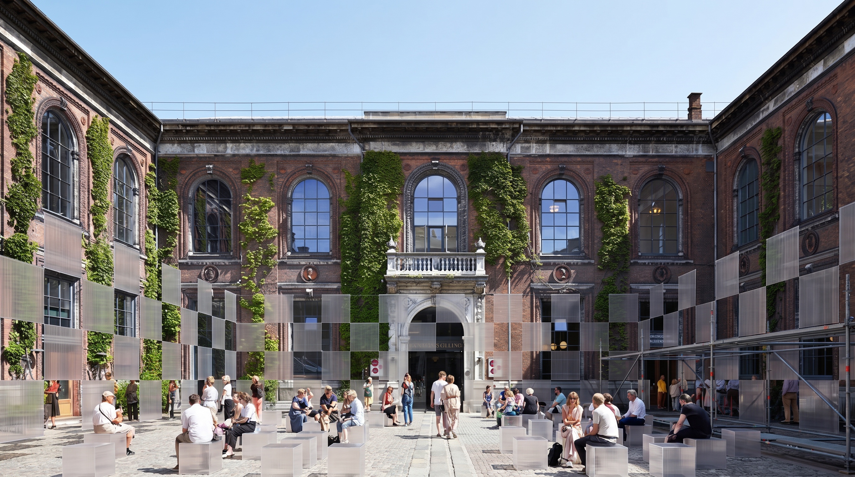 night render make each polycarbonated sheet and glowing and reflecting light add a lot of people standing and enjoying the installation make a beautiful realistic night immersive and dramatic render in the style of a mir render